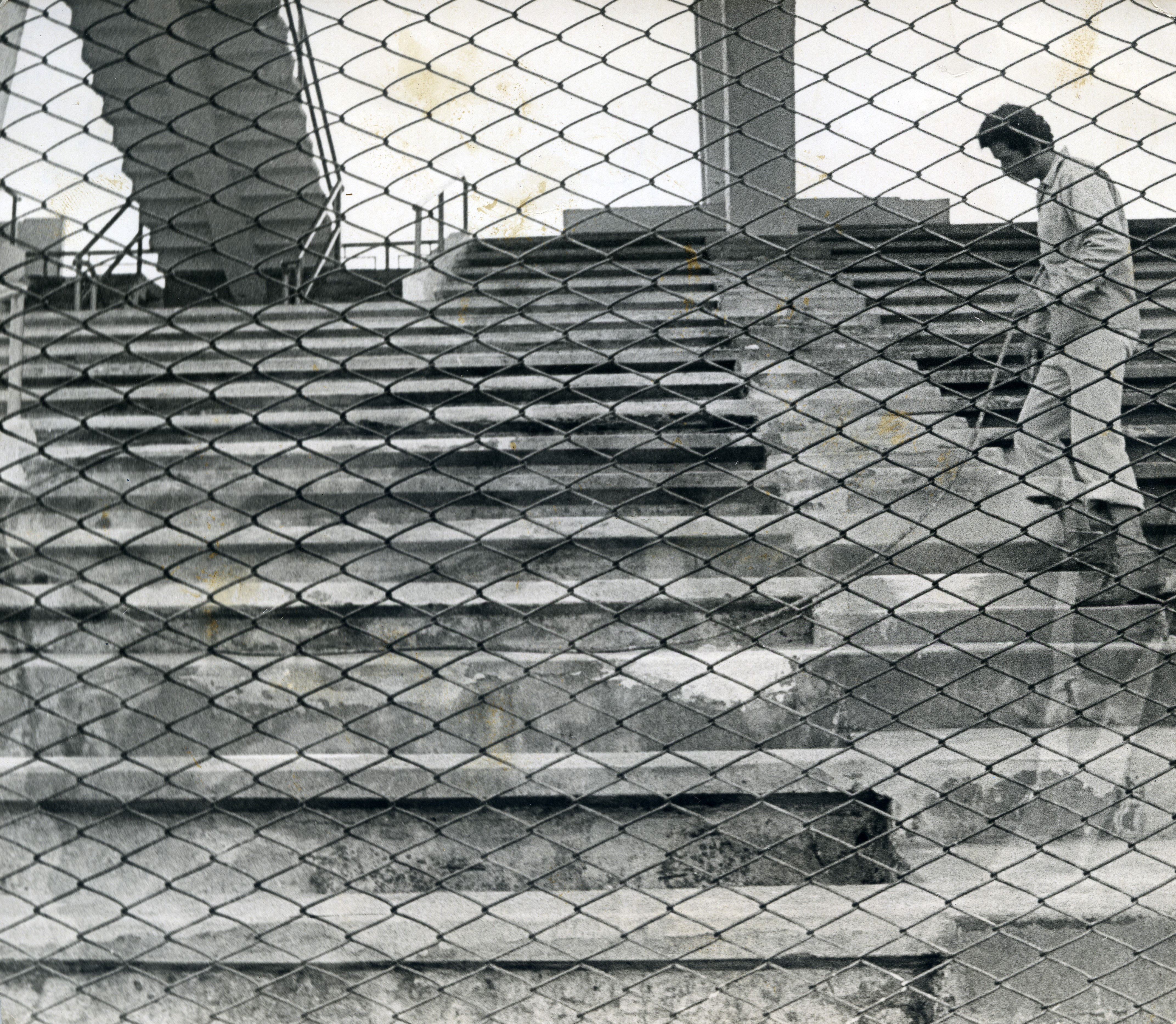 La fotografía da cuenta de la siguiente información: “Se aprecia a un hombre realizando labores de mantenimiento en una de las tribunas del estadio Pascual Guerrero”.