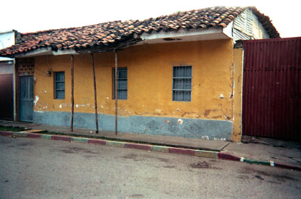 Primer plano. Exterior día. Fachada de casa en bahareque. Tonos claros. Superficie desgastada por paso del tiempo.