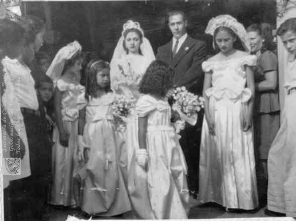 Notése la elegancia de los trajes para estas ceremonias en los novios y en la comitiva que los acompaña. C. 1960