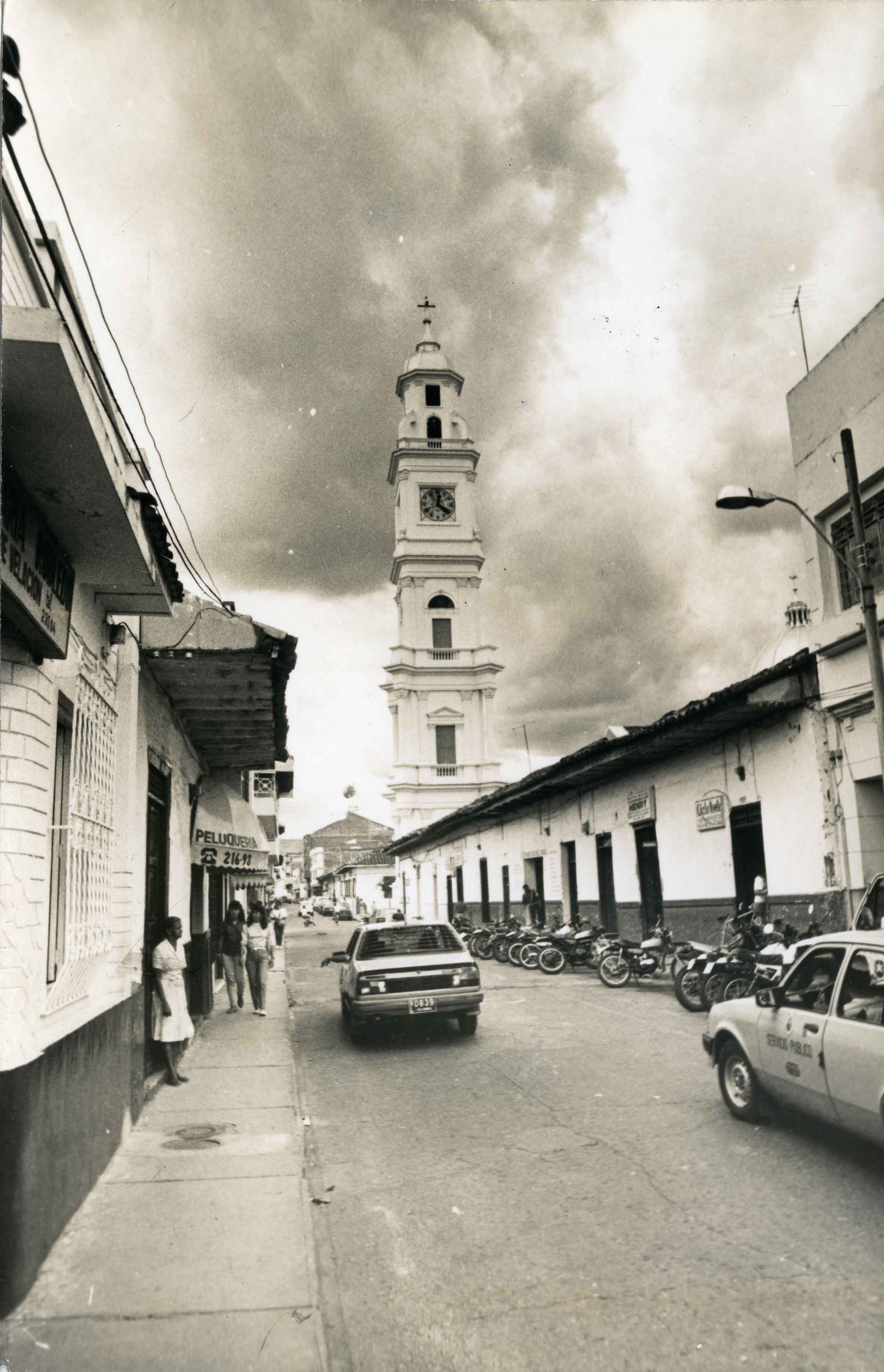 Vehiculos transitando por una calle desde la que se aprecia la torre de la iglesia de Nuestra Señora del CarmenEl Archivo del Patrimonio Fotográfico y Fílmico del Valle del Cauca es responsabilidad de la Biblioteca Departamental del Valle Jorge Garcés Borrero, por convenio de cooperación suscrito con la Secretaria del Cultura Departamental, con el fin de aunar esfuerzos para su conservación, preservación y divulgación del Archivo entre la comunidad Vallecaucana, especialmente entre los estudiantes e investigadores que visitan la Biblioteca, propiciando el su uso y consulta permanente. La universidad Icesi es un colaborador en el proceso de difusión, facilitando la tecnología que permite la consulta de las imágenes.
