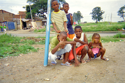 Imagen tomada en exterior junto a un poste metálico. Puesta en escena de un grupo de niños, con su mirada dirigida hacia la cámara. Los niños tienen expresión alegre en su rostro. Plano medio.