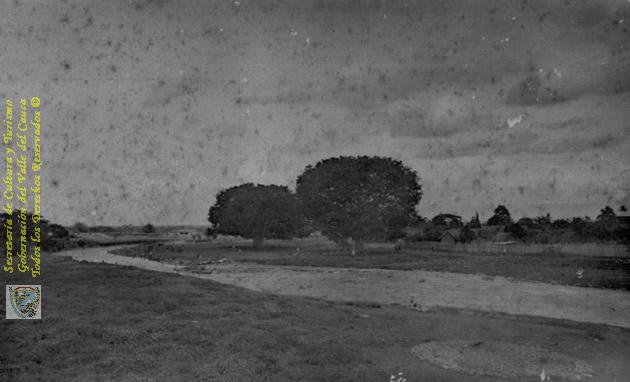 Camino bordeado de ceibas, al fondo al costado derecho se alcanza a perfilar la Ermita. Santiago de Cali, 1895.