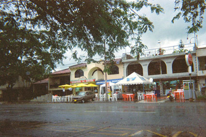 Plano medio. Imagen tomada en exterior, donde se puede apreciar una vía pavimentada y al fondo algunas viviendas con locales comerciales en el primer piso. Al extremo izquierdo las ramas de un árbol.