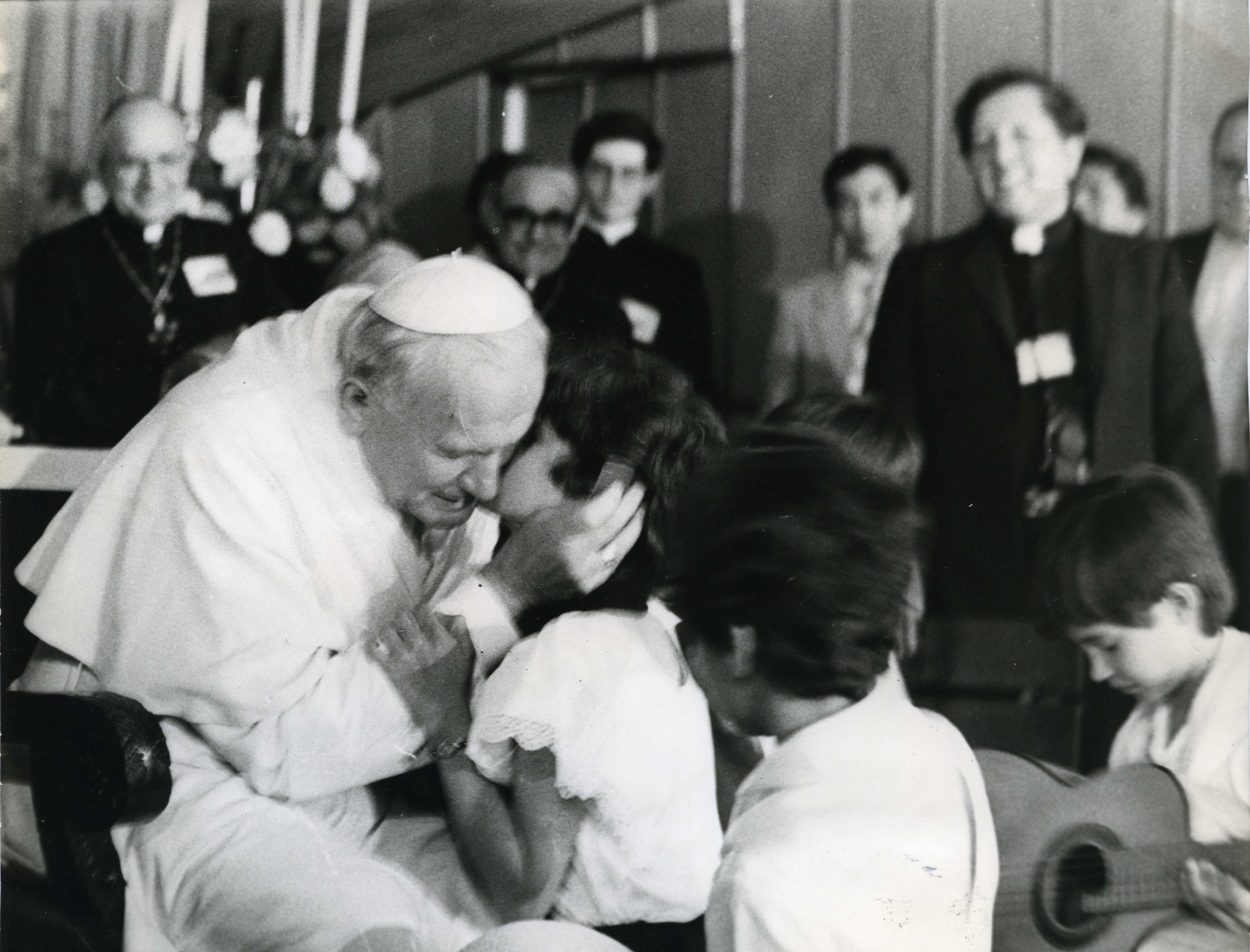 López, L. (1986). Papa Juan Pablo II saludando a unos niños misioneros. Santiago de Cali: Biblioteca Departamental Jorge Garcés Borrero.