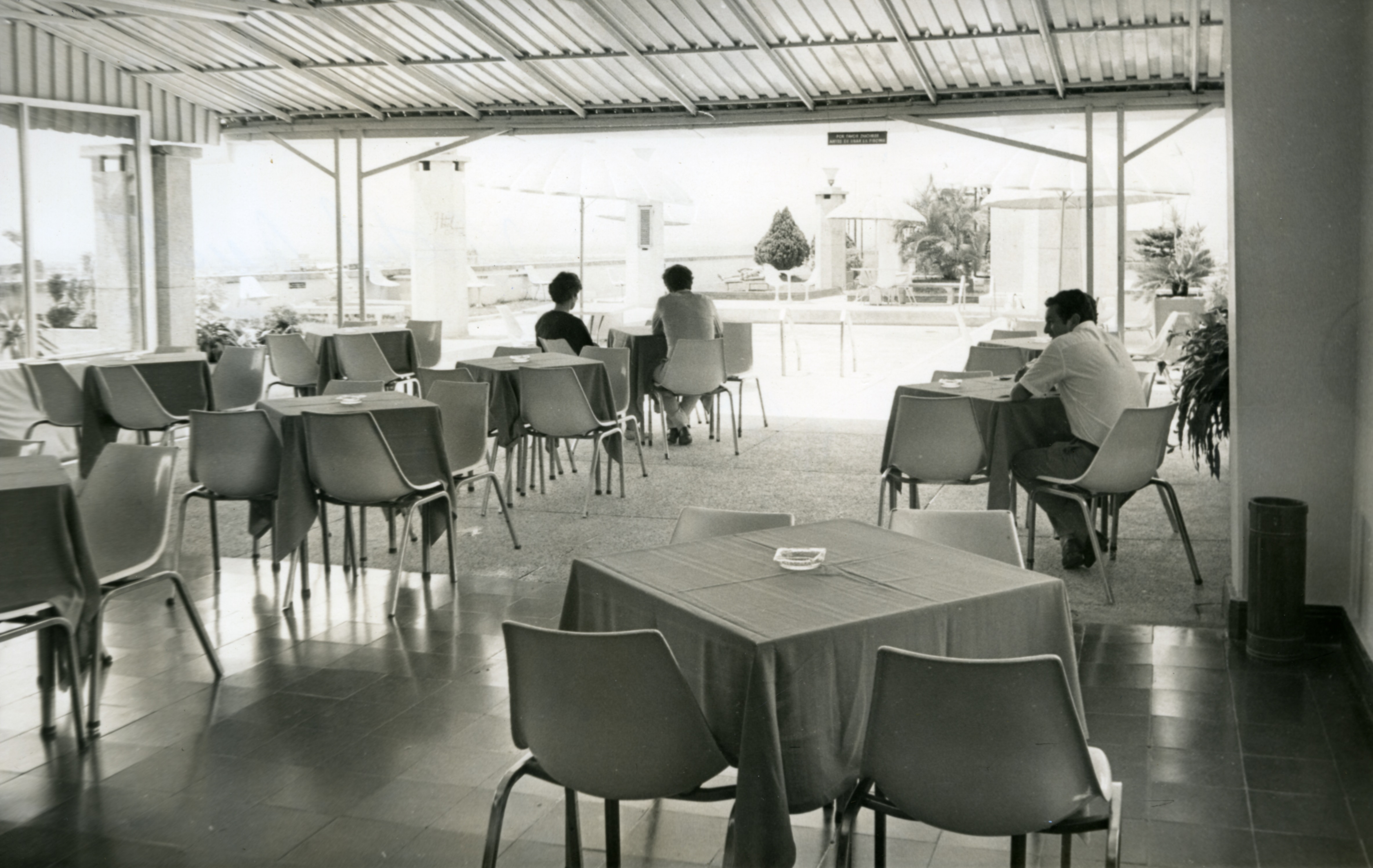 Se observan las mesas de la cafetería y al fondo la piscina de hotel.
