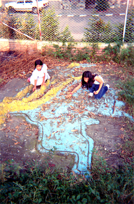 Dos niñas juegan en interior de un patio con maleza y hojas secas. Se observa al mapa de Colombia con sus cordilleras en color amarillo. Al fondo reja y calle. Exterior día. Plano medio. Toma en picado.