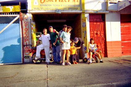 Plano Medio. Un grupo de personas esta posando en la fachada de un local comercial, aparte del grupo de personas en el bano de entrada al local, se destacan los colores saturados utilizados en las fachadas.