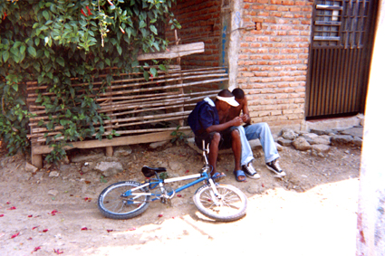Plano medio. En la imagen se puede apreciar dos jóvenes sentados junto a una vivienda con muros de ladrillo a la vista. Al extremo izquierdo algunos árboles. Toma realizada con luz día.