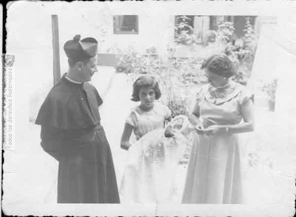 En el patio de la casa cural el reverendo Castrillón, la señora Silvia Upegui y sus dos hijos. Pradera. 1950.