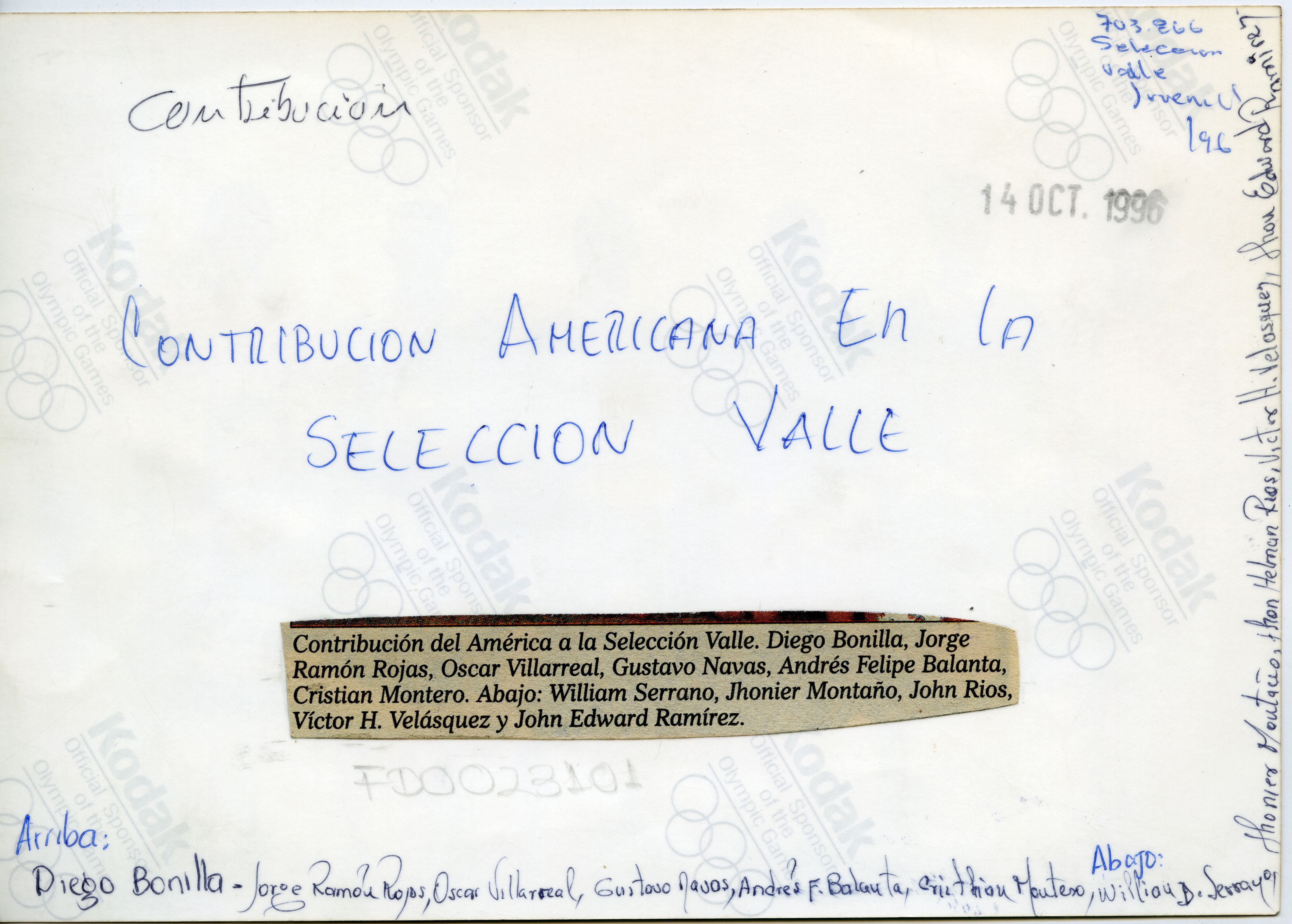 Al reverso de la fotografía se anexa recorte: Contribución del América a la selección Valle. Abajo: Diego Bonilla, Jorge Ramón Rojas, Oscar Villareal, Gustavo Navas, Andrés Felipe Balanta, Cristian Montero. Abajo: William Serrano, Jhonier Montaño, John Rios, Víctor H. Velásquez y John Edward Ramírez