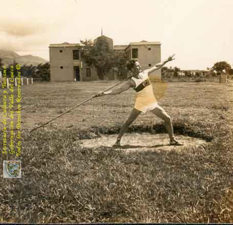 Lanzando jabalina . Justas deportivas. Cali, C. 1945. La iluminación es manual