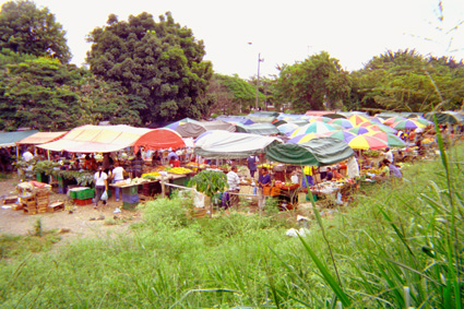 Plano General. La vegetación abundante encierra los parasoles multicolor que definen una forma similar a un triangulo invertido. Se observan personas y productos de mercado entre las carpas.