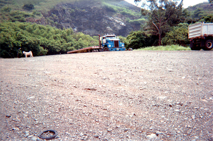 Plano general. Perspectiva a ras de piso. Terreno destapado. En el centro de la imagen una tractomula. Al lado izquierdo un perro observando. Al fondo montaña con señas de ser explotada comercialmente.