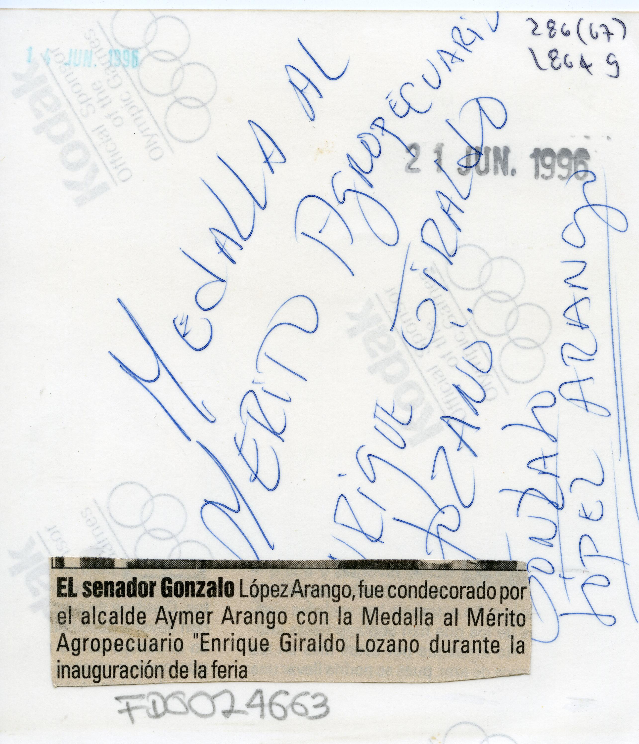 En la gráfica el senador Gonzálo López Arango es condecorado por el alcalde Aymer Arango