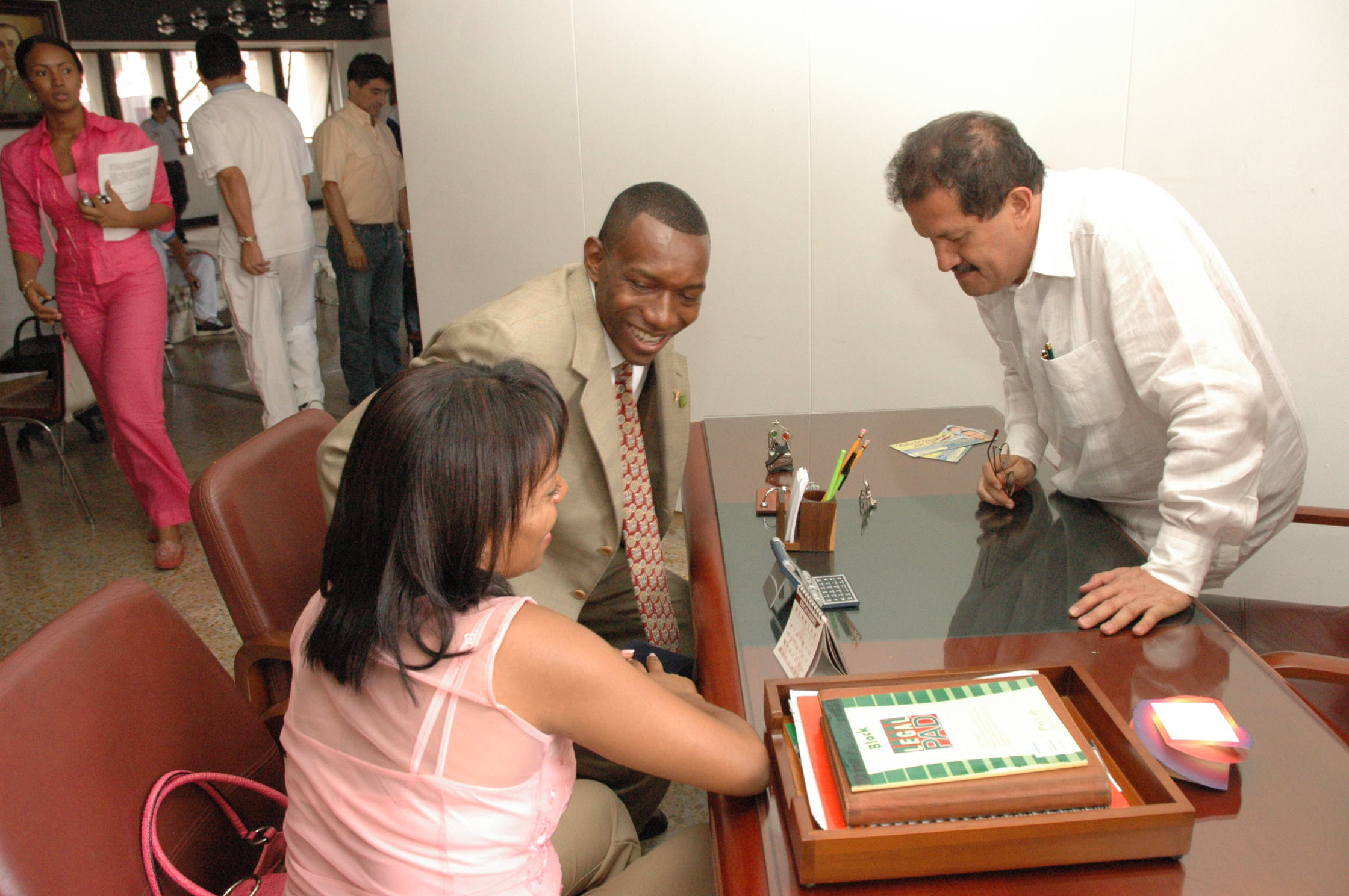 Registro fotográfico donde se aprecia al gobernador del Valle del Cauca Angelino Garzón tomando asiento para dialogar con dos personas una dama y un caballero.