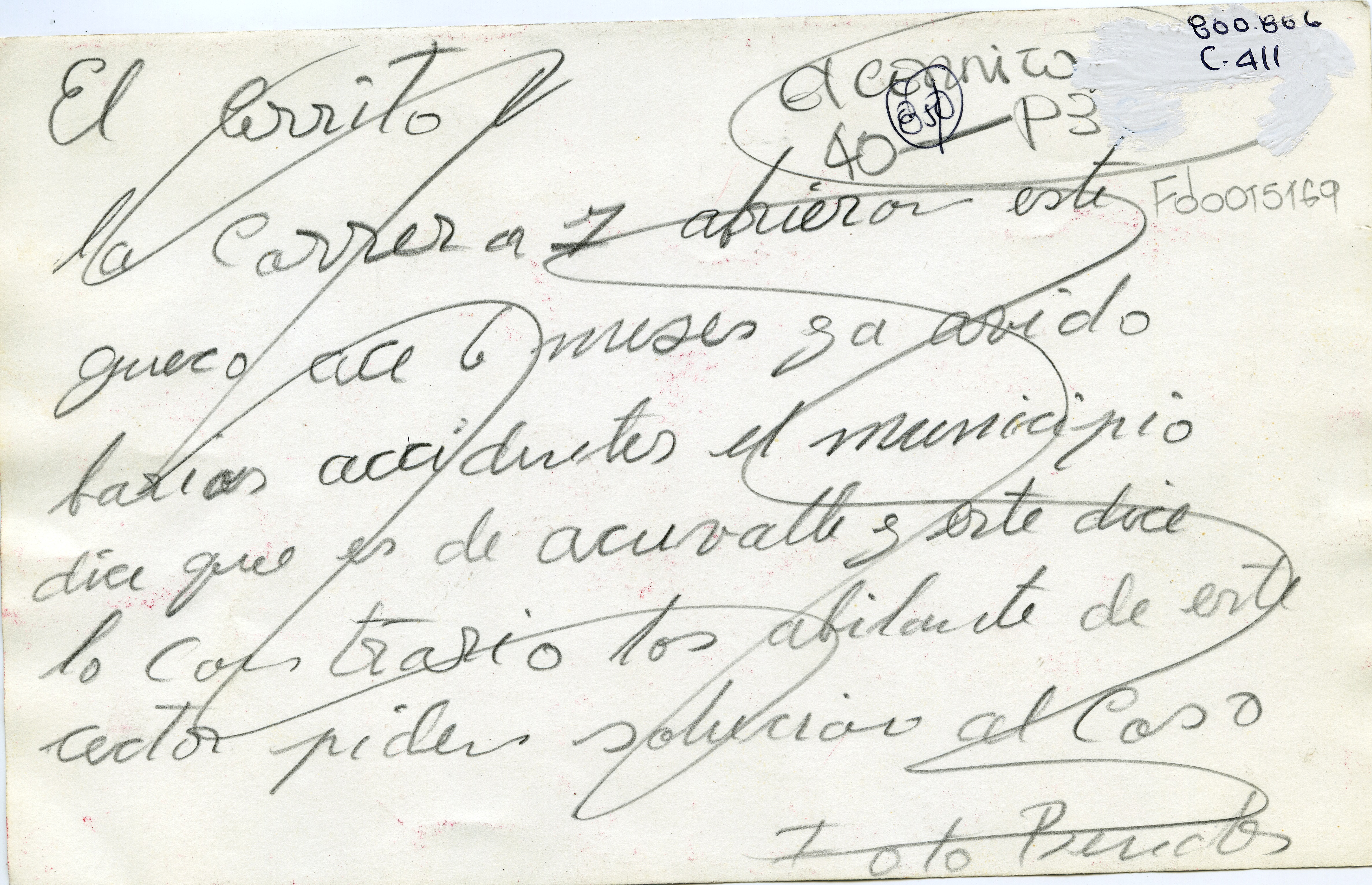 dc.description.abstract | Hueco en la calle. Al reverso de la fotografía se anexa: "El Cerrito. la Carrera 7 abrieron este hueco hace 6 meses, ha habido varios accidentes, el municipio dice que es de Acuavalle y este dice lo contrario, los habitantes de este sector piden solucionar el caso". | spa |