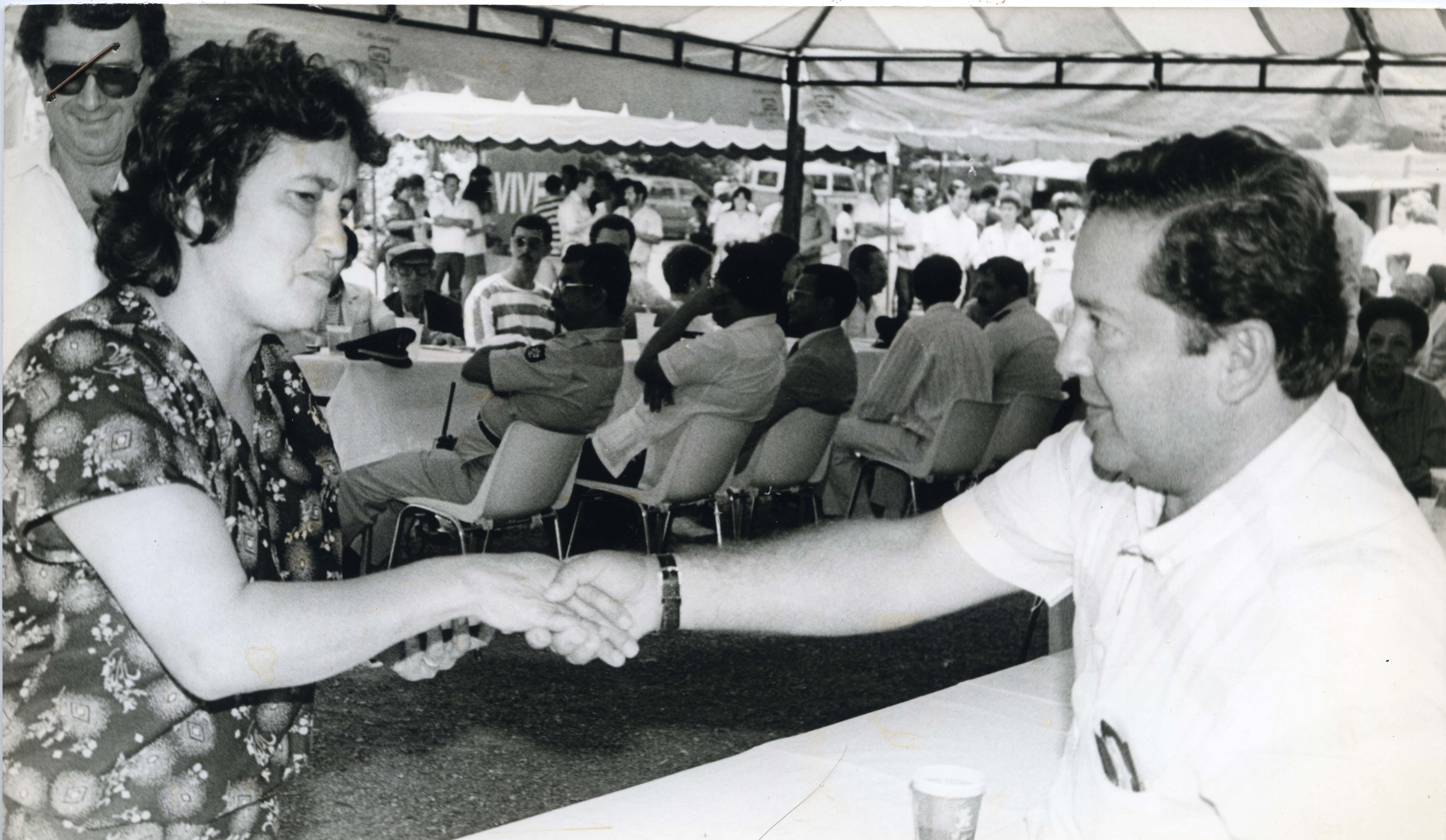 En el pie de foto dice lo siguiente: Ciriano Fernandez Millan, jefe de asuntos rurales del Municipio, felicita a Leonor Sánchez, por resultar ganadora en el concurso ecológico "Vivero Felipe Torres Legarreta", obtuvo un premio de $150.000. El concurso es auspiciado por los Productores de Agregados Minerales para concretos y pavimentos.