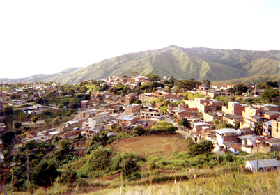 Plano general. En la imagen se destaca una vista general del barrio Terrón Colorado, se observan viviendas ubicadas en medio de zonas verdes. Al fondo se visualiza una de las montañas que rodean el barrio.