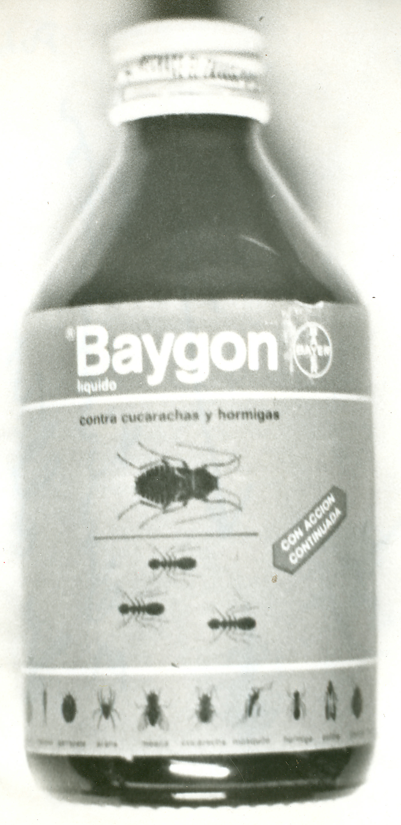 Insecticida en líquido Baygon. // El Archivo del Patrimonio Fotográfico y Fílmico del Valle del Cauca es responsabilidad de la Biblioteca Departamental del Valle Jorge Garcés Borrero, por convenio de cooperación suscrito con la Secretaría de Cultura Departamental, con el fin de aunar esfuerzos para la conservación, preservación y divulgación del Archivo entre la comunidad Vallecaucana, especialmente entre los estudiantes e investigadores que visitan la Biblioteca, propiciando su uso y consulta permanente. La universidad Icesi es un colaborador en el proceso de difusión, facilitando la tecnología que permite la consulta de las imágenes.