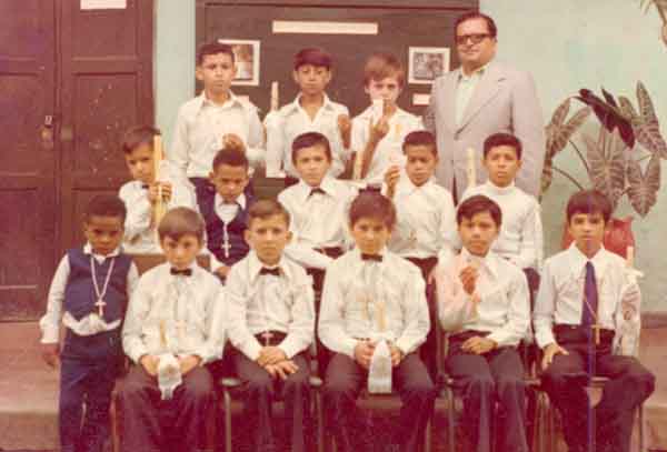 El profesor Pedro Antonio Rojas acompañado por un grupo de alumnos de la escuela John F. Kenedy que realizaban su primera comunión. Yotoco, C.1980.