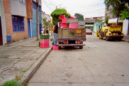 Padilla, A. M. (2005). Plano medio de una vía pavimentada donde se puede apreciar una camioneta en la cual hay un hombre cargando algunas canastas de colores variados. Santiago de Cali: Biblioteca Departamental Jorge Garces Borrero.