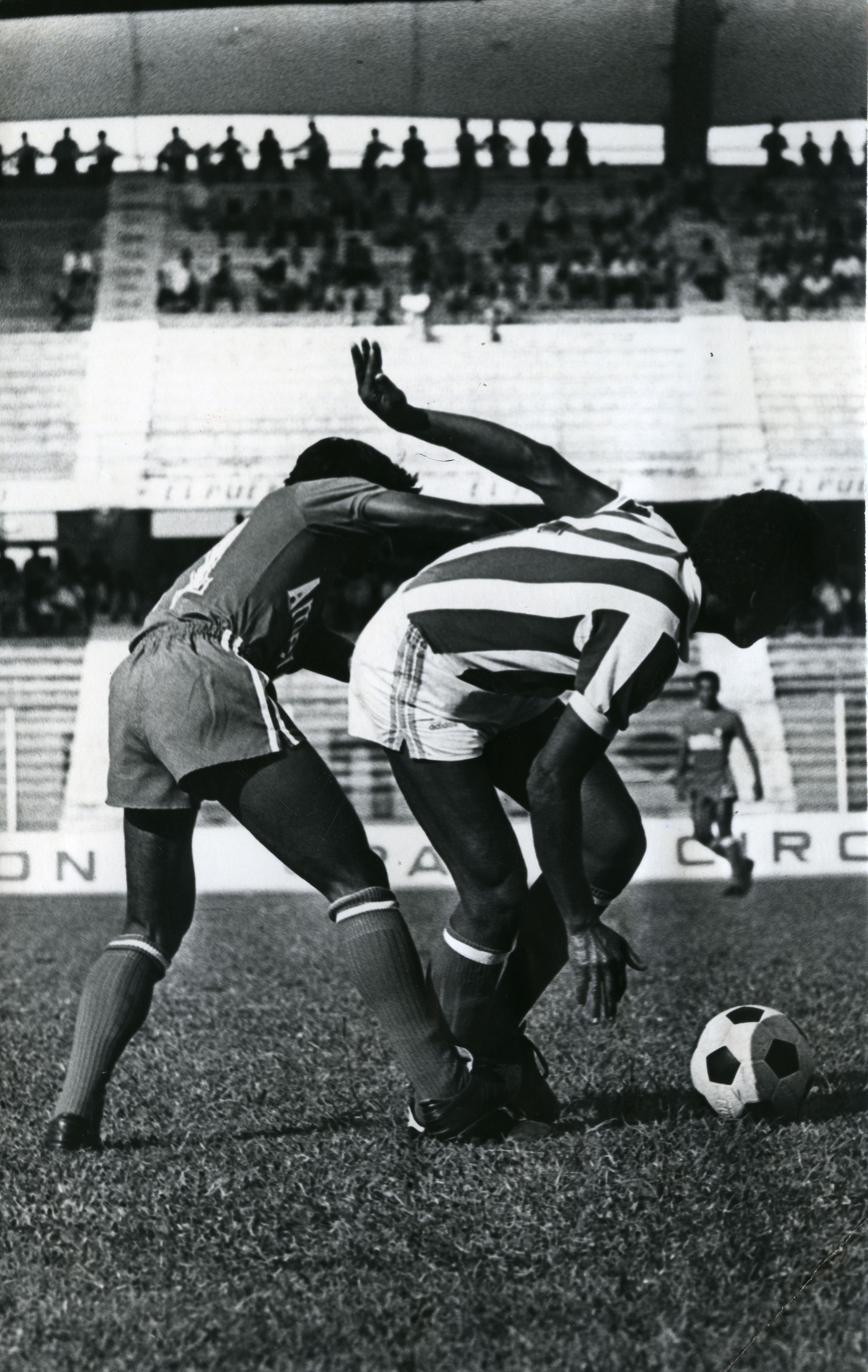 Partido de fútbol América vs Nacional, en el estadio Olímpico Pascual Guerrero. Se aprecia jugadores disputando el balón