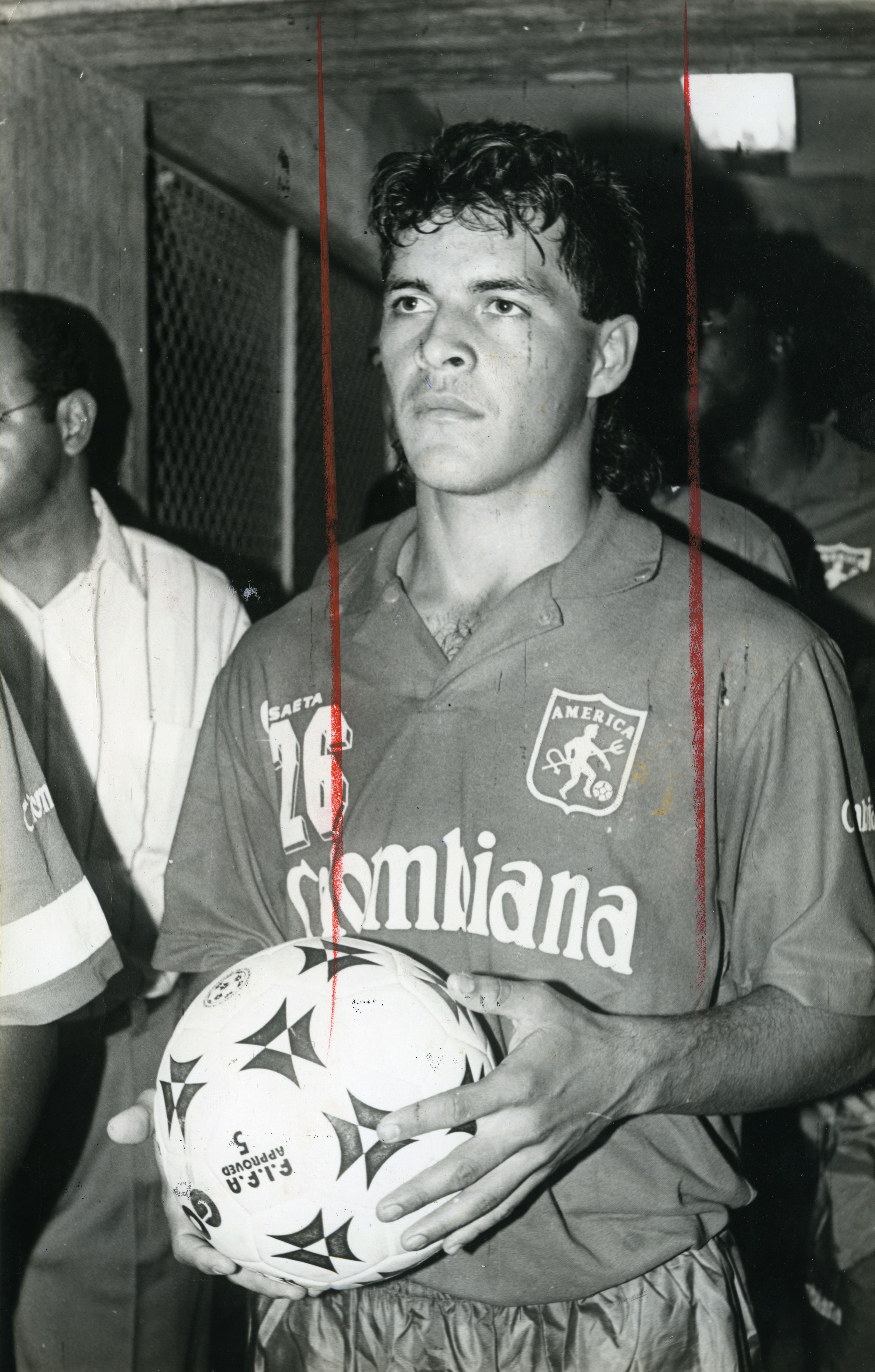 Wilmer Ortegón, saguero central del América de Cali. En la gráfica se aprecia al jugador sosteniendo la pelota con las manos