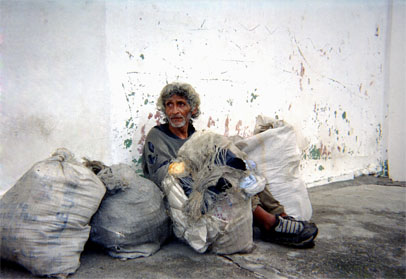 Plano medio. Toma frontal. Retrato de indigente. Expresión triste.
