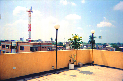 Plano general. Panorámica del barrio. En primer plano terraza de una edificación. En el plano medio lado izquierdo una antena de repetición de señal de celulares. Cielo despejado con presencia de pocas nubes.