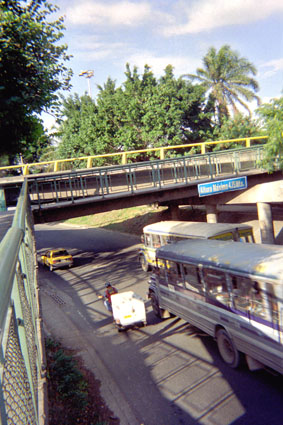 Plano general. Imagen tomada en exterior, desde un puente peatonal, donde se puede apreciar una vía pavimentada por la que transitan varios vehículos. Al fondo varios árboles frondosos.