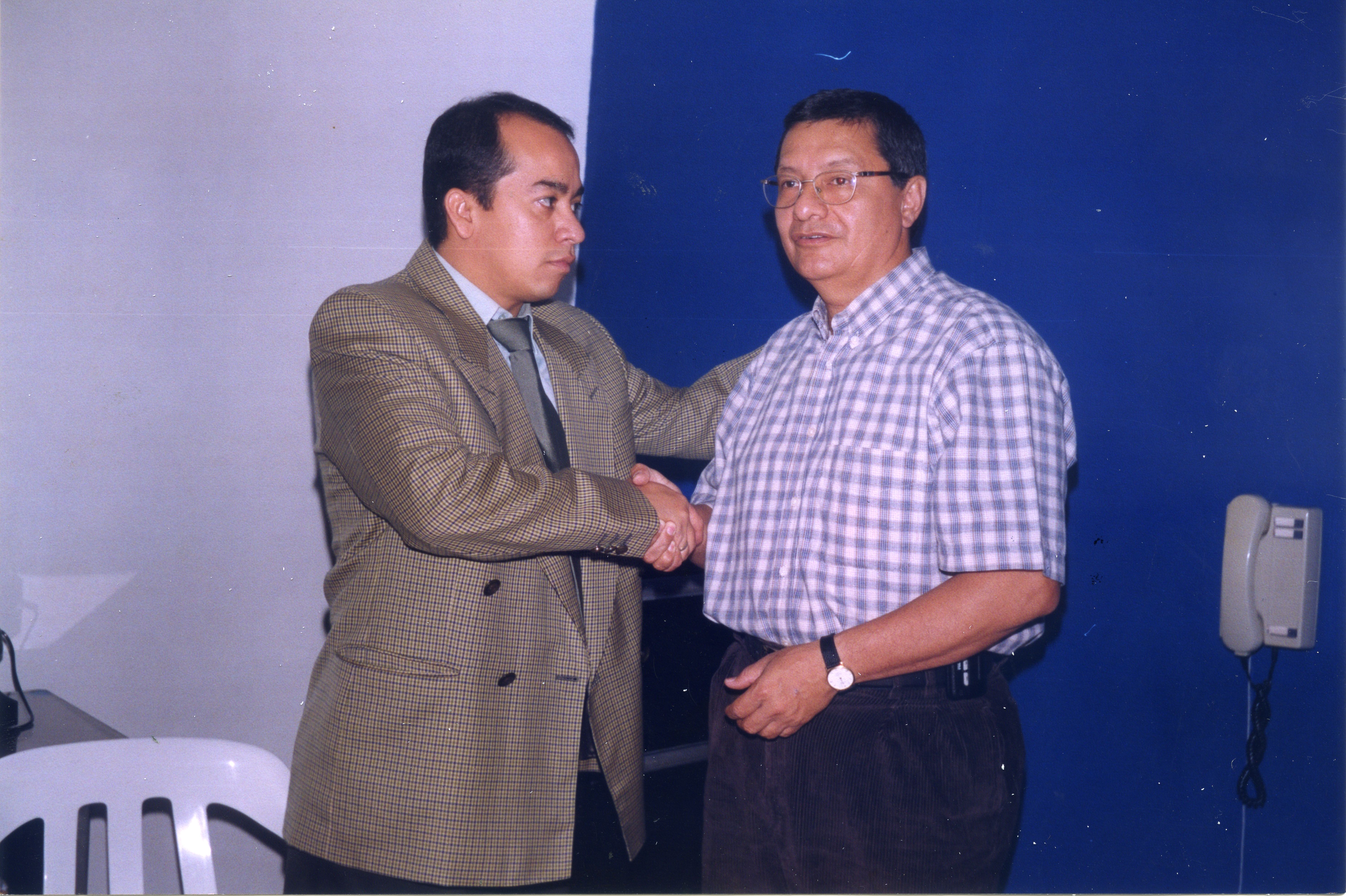 En la fotografía podemos observar al señor Rosemberg Pabón Pabón junto a Fabio Ariel Cardozo Montealegre dándose la mano en señal de la alianza que formarán para el trabajo en equipo. Al reverso de la fotografía se anexa recorte: "Con Rosemberg. El ex concejal de Cali, Fabio Ariel Cardozo Montealegre, declinó ayer su candidatura a la alcaldía de Cali, para vincularse a la campaña del licenciado Rosemberg Pabón. "Tres hechos motivaron mi decisión: el programa de gobierno, el liderazgo de Pabón Pabón y las propuestas, que ha presentado, para sacar a Cali, de la crisis en que se encuentra."