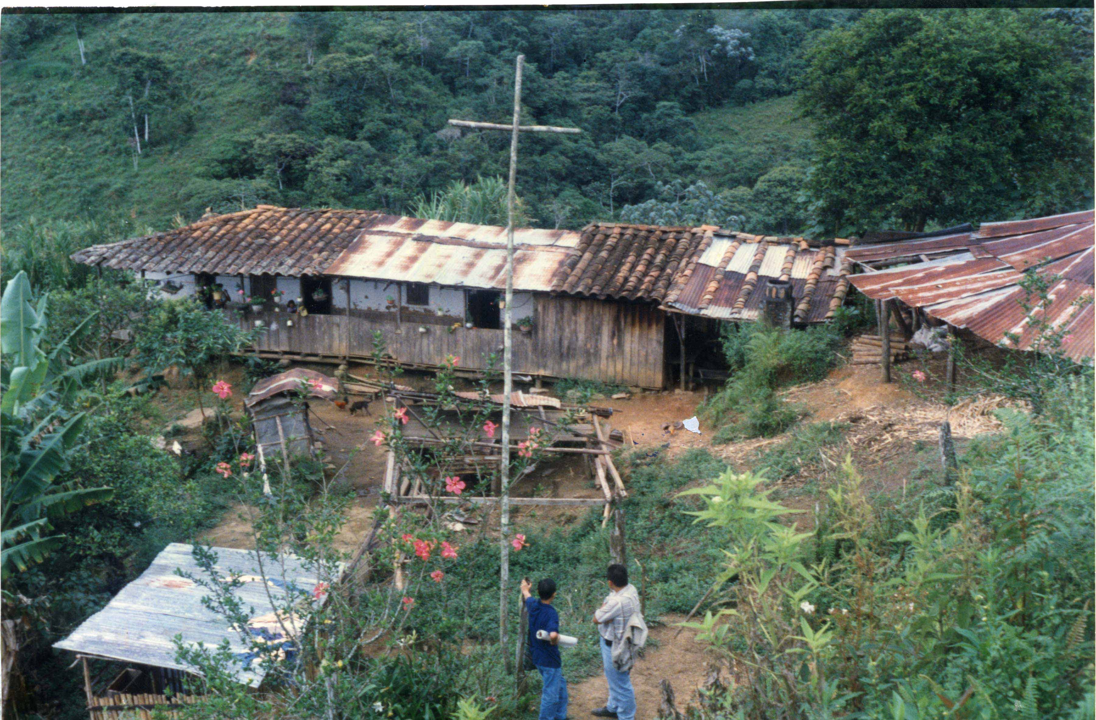Argelia, Valle del Cauca. Fundado en 1904, por Manuel Mejía, José Antonio Murillo, Epifanio Chávez y Justiano Hincapié. Municipio desde 1956. En la foto aparece el profesor Jhon Jairo Galeano, de derecha a izquierda. Observamos al profesor hablando con otro hombre. Se aprecia la vivienda y el espacio rural