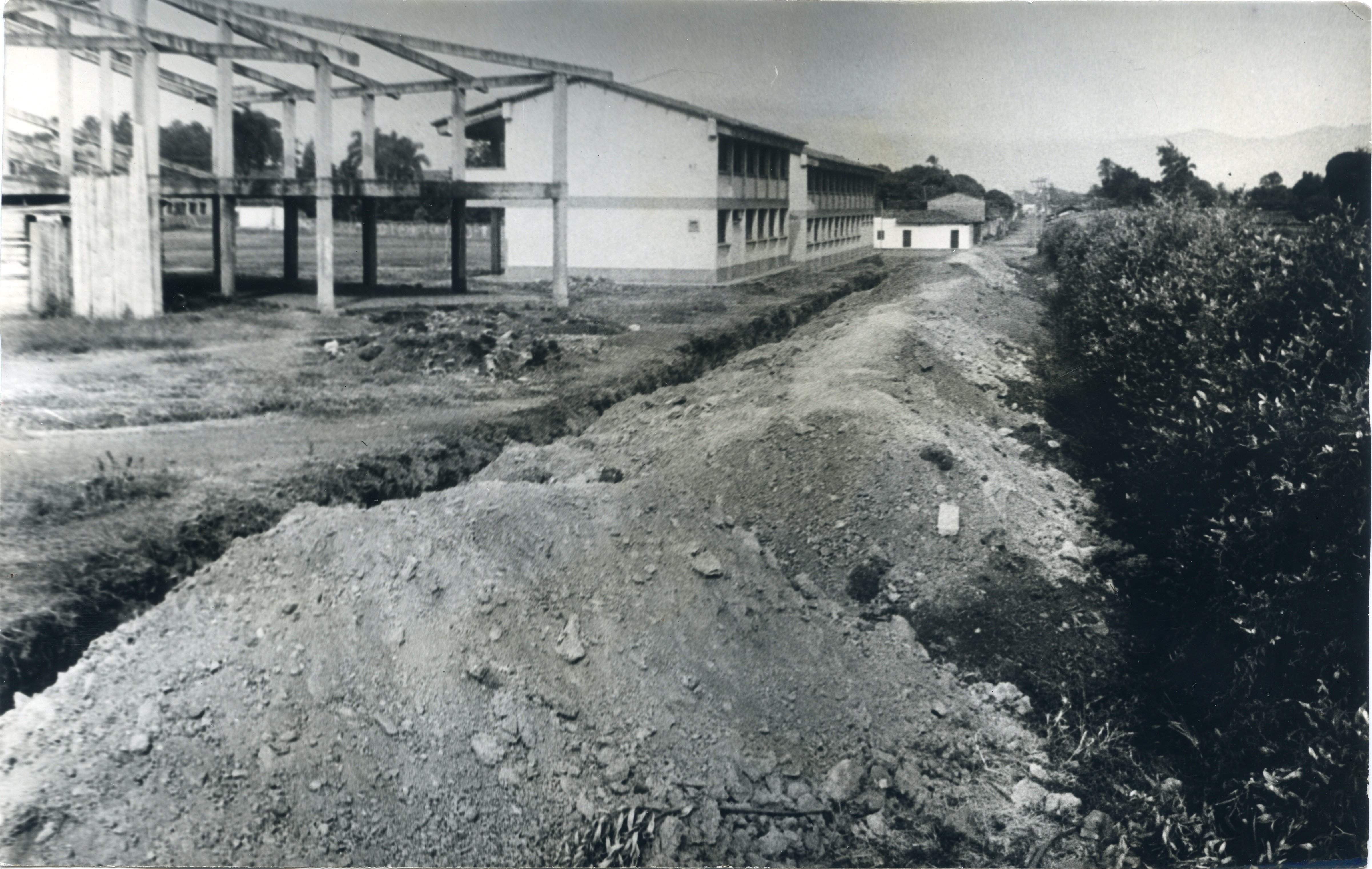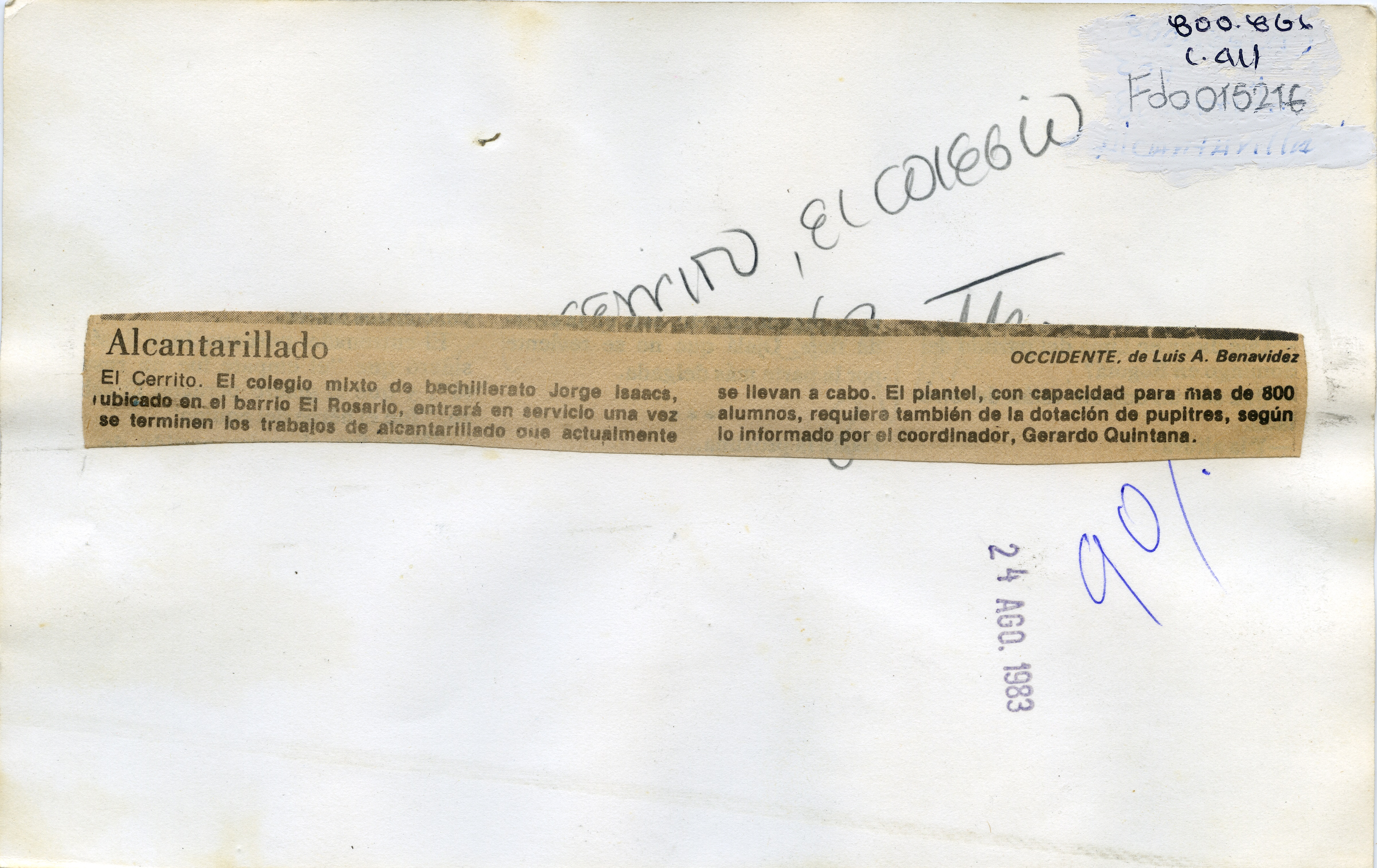 Al reverso de la fotografía se anexa el pie de foto del periódico: "Alcantarillado. El Cerrito. El colegio mixto de bachillerato Jorge Isaacs, ubicado en el barrio El Rosario, entrará en servicio una vez se terminen los trabajos de alcantarillado que actualmente se llevan a cabo. El plantel, con capacidad para mas de 800 alumnos, requieren también de dotación de pupitres, según lo informado por el coordinador, Gerardo Quintana. ".