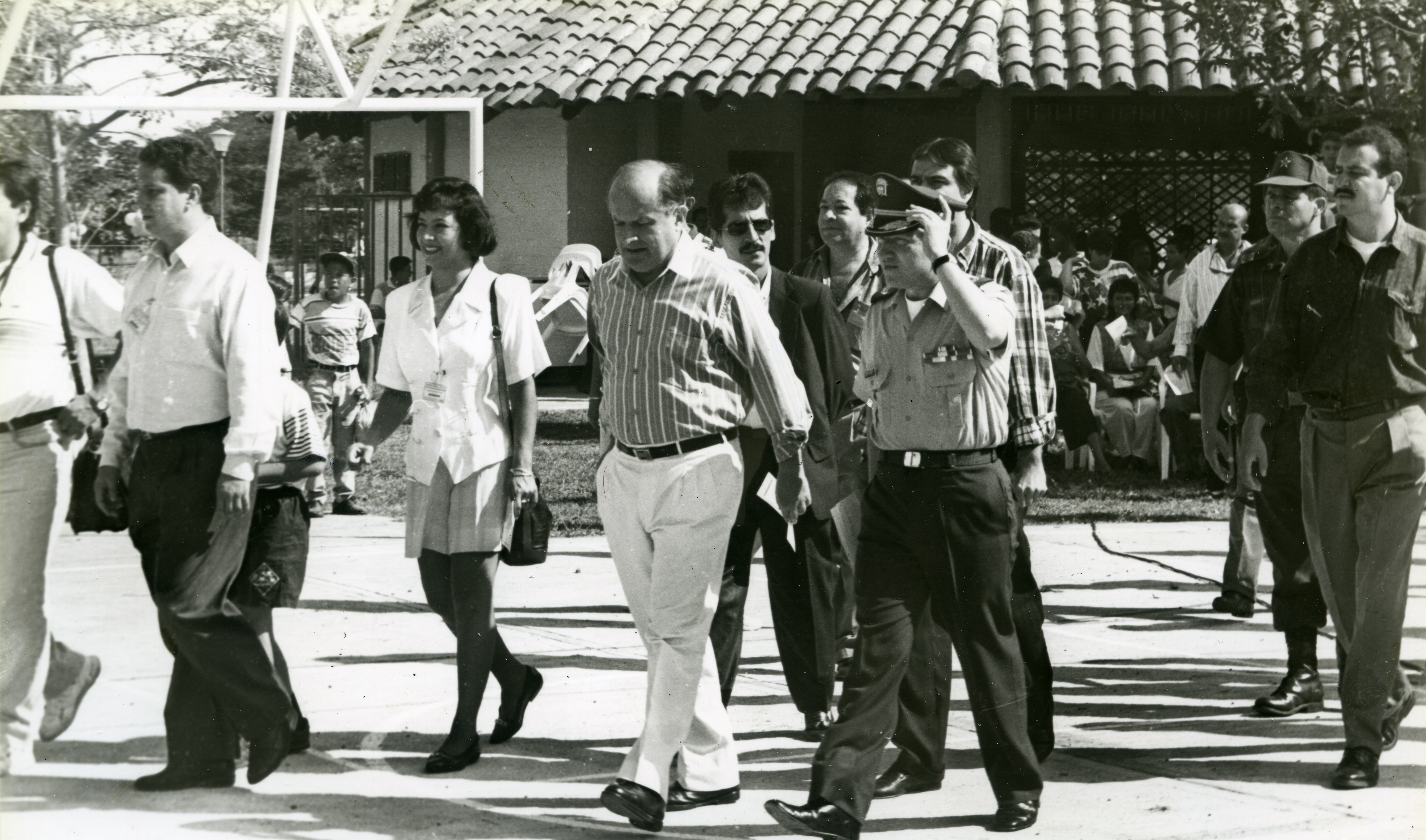 Nota en manuscrito reverso de la foto: Visita del gobernador a Zarzal, Germán Villegas Villegas. Foto César Urbano. Observamos al gobernador con autoridades del municipio