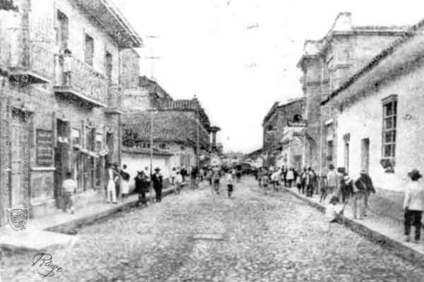 Calle Sarmiento, Tuluá, apréciese el empedrado de la calle y los atuendos de los transeuntes. algunas de estas edificacioes hoy no existen.. 1920.