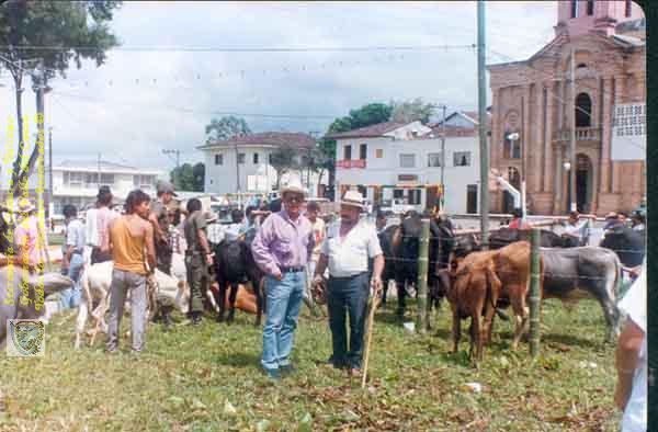 SAUL NIETO (1988). Horacio Valencia y el ex-alcalde Julio César Bedoya, en la plaza principal durante la Feria Ganadera, Ulloa, C & 401046. ULLOA: Biblioteca Departamental Jorge Garces Borrero.