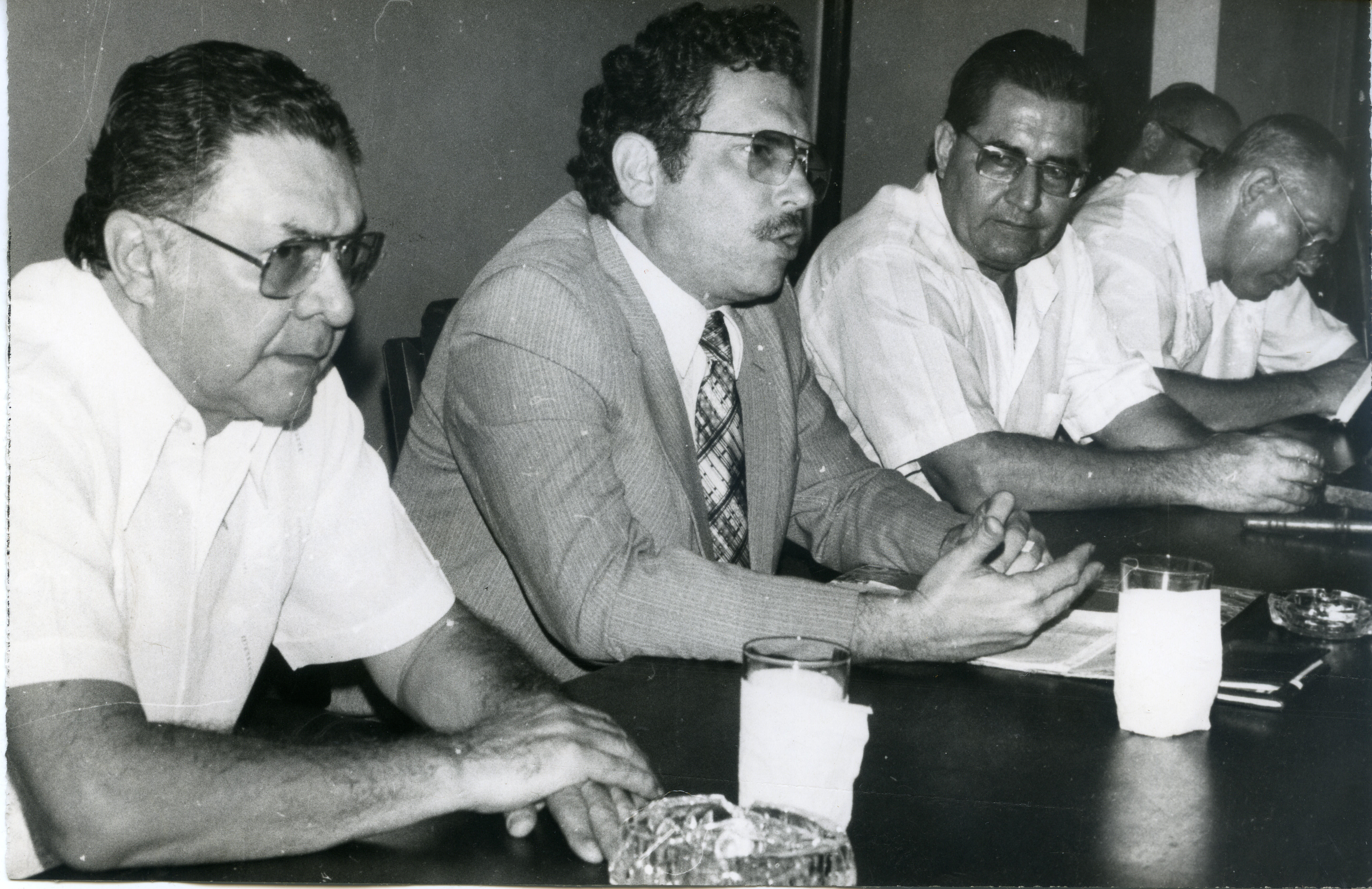 En la fotografía podemos observar a Carlos Holguín Sardi reunido con algunos dirigentes de la localidad de Buenaventura, para solicitar la unión del partido conservador. Al reverso de la fotografía se anexa recorte: "Unión Conservadora. Buenaventura. El presidente del Congreso, Carlos Holguín Sardiaparece aquí con dirigentes de la localidad, durante la reciente concentración política que realizó en el puerto. Holguín Sardi solicitó la unión del partido conservador, en busca de un triunfo en las elecciones de Mitaca."