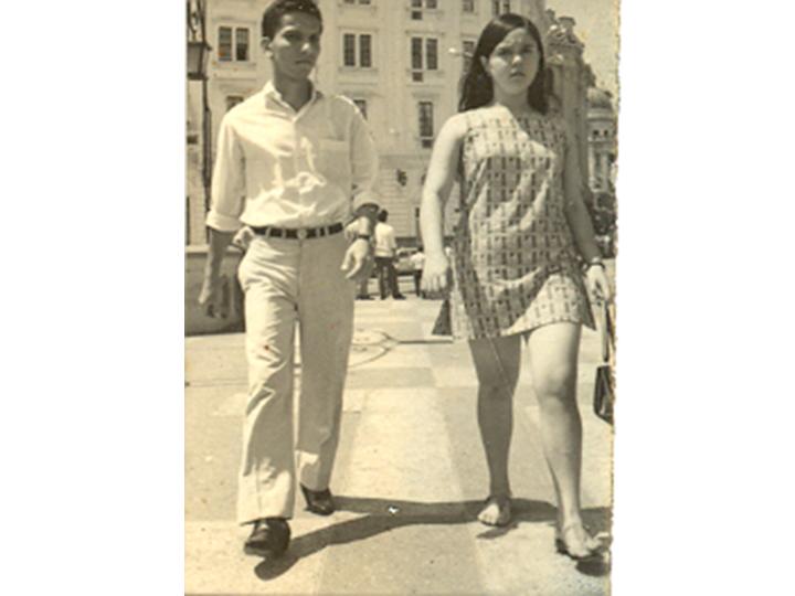 Ernesto Florez Amaya y María Mercedes Amaya, paseando por el Puente Ortíz. Al fondo se aprecia el Hotel Alferez Real. Santiago de Cali, 01-05-1968