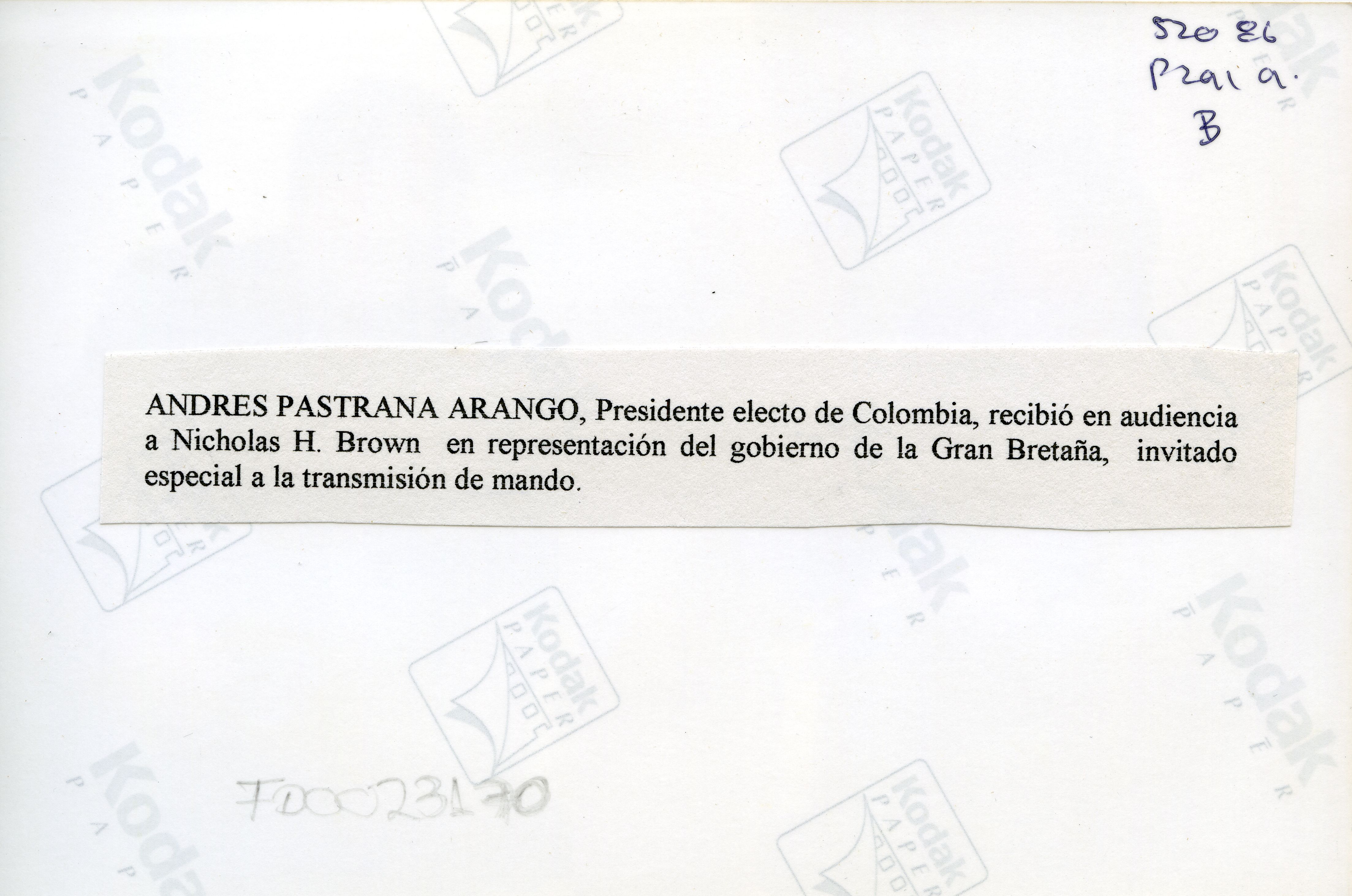 Al reverso de la fotografía se anexa recorte: "Andrés Pastrana Arango, presidente electo de Colombia, recibió en audiencia a Nicholas H. Brown en representación del gobierno de la Gran Bretaña, invitado especial a la transmisión de mando."