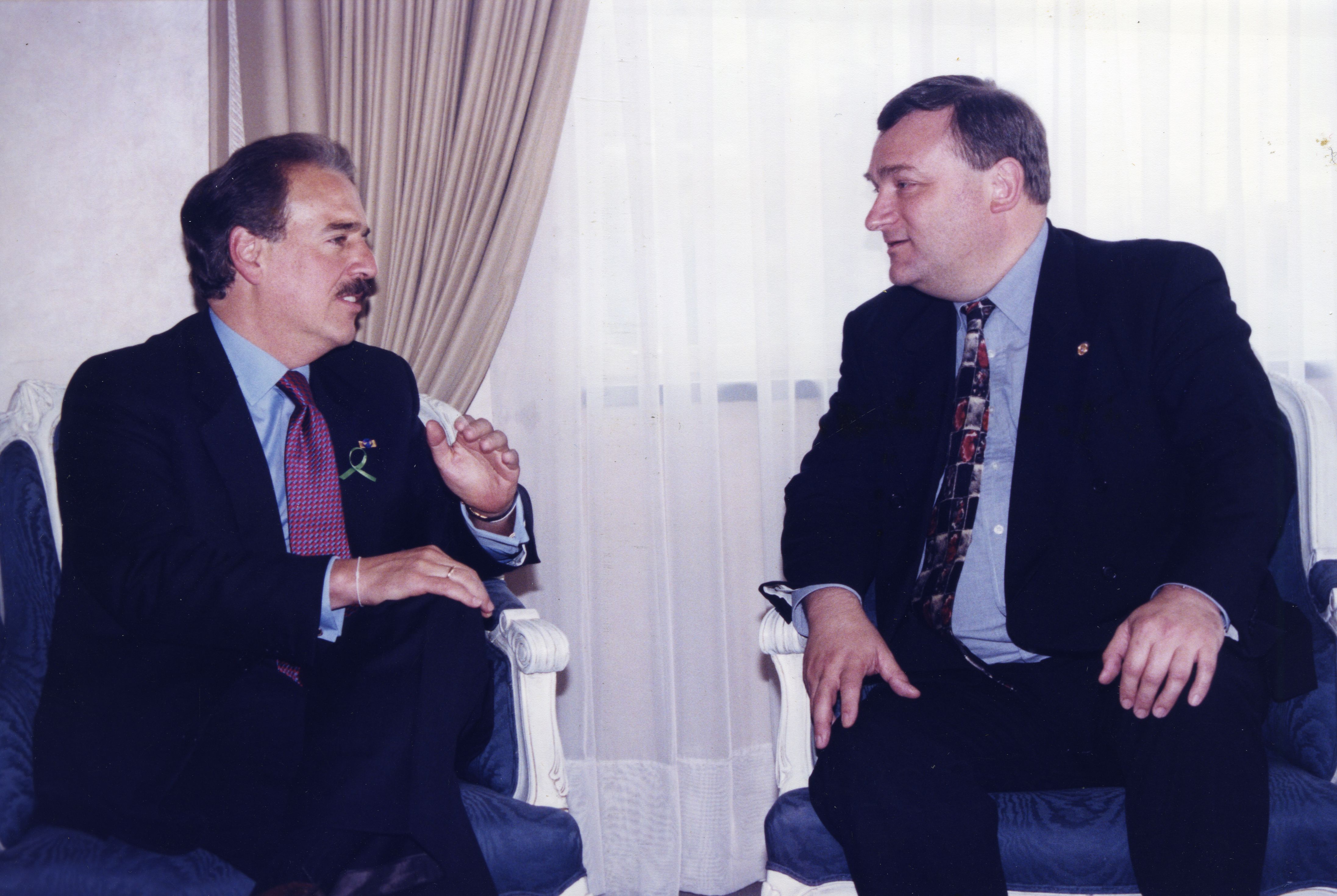 En la fotografía podemos observar al presidente electo Andrés Pastrana Arango junto a Nicholas H. Brown representante del Gobierno de Gran Bretaña.