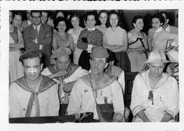 Fiesta de disfraces en el Club Colonial: Entre otros participan: Rafael Villegas R., Javier Santacruz, Braulio Gardeazábal, Hernando Escobar, Lucero Caicedo, Luisa Jaramillo, Gloria Caicedo, Clara Cruz de Villegas.Tuluá, 1952.