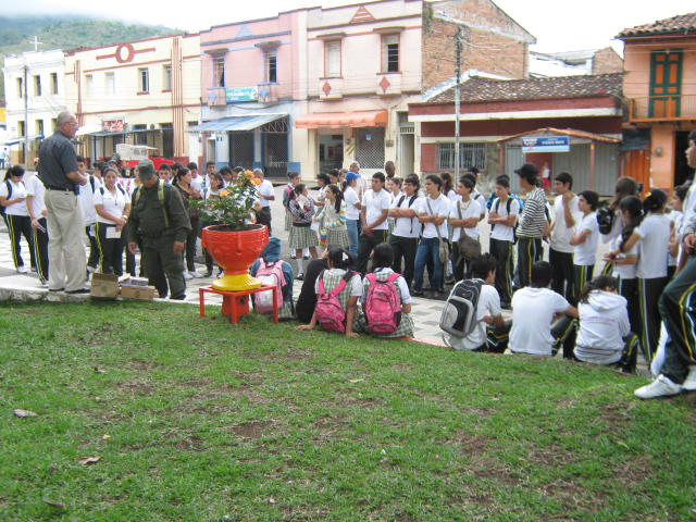 Trujillo, Valle del Cauca. Fundado en 1924, por Leocadio y Rafael Salazar. Nombres: Vernaza. Municipio desde 1930. Economía importante en agricultura, caficultura, ganadería, explotación forestal, entre otros. Atractivo turístico: Iglesias, Charco El Pailón, Monumentos a los Derechos Humanos, Parador El Tablazo. Observamos en la imagen, licenciado Armando Ramírez dando instrucciones para la jornada de limpieza y descontaminación del río culebras a los estudiantes de los colegios Sagrado Corazón de Jesús y Julián Trujillo