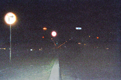 Plano general. Imagen tomada en exterior, de noche, con flash, donde se puede apreciar las señales de tránsito de una vía.