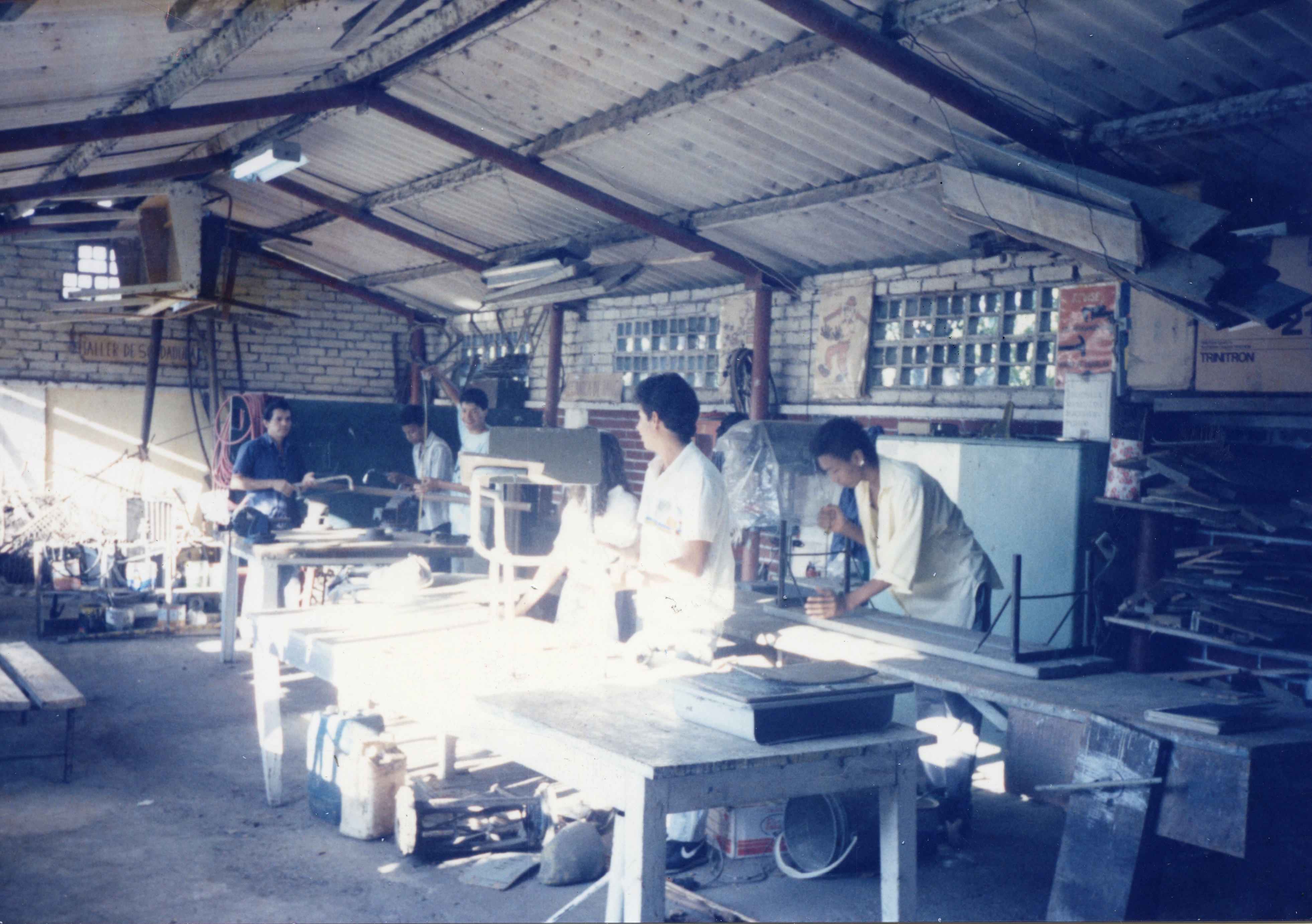 Grupo de cuatro hombres y dos mujeres realizando tareas de metalistería, aparentemente, en talleres de la Universidad Santiago de Cali.