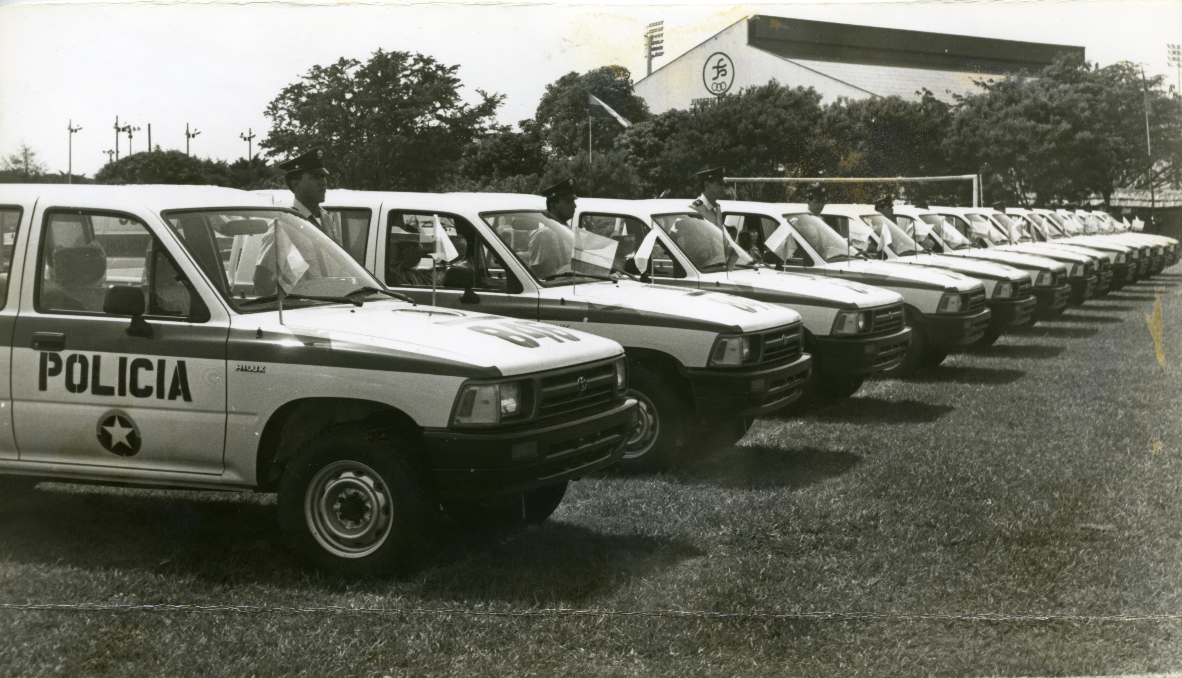 En la fotografía se observa entrega de 20 camionetas chevrolet Luv Hilux, 180 motocicletas y 200 radios de comunicación, la Policía Metropolitana de Cali incrementará notoriamente la seguridad sobre la ciudad, reforzados desde el aire con un elicóptero. Observamos desfile militar