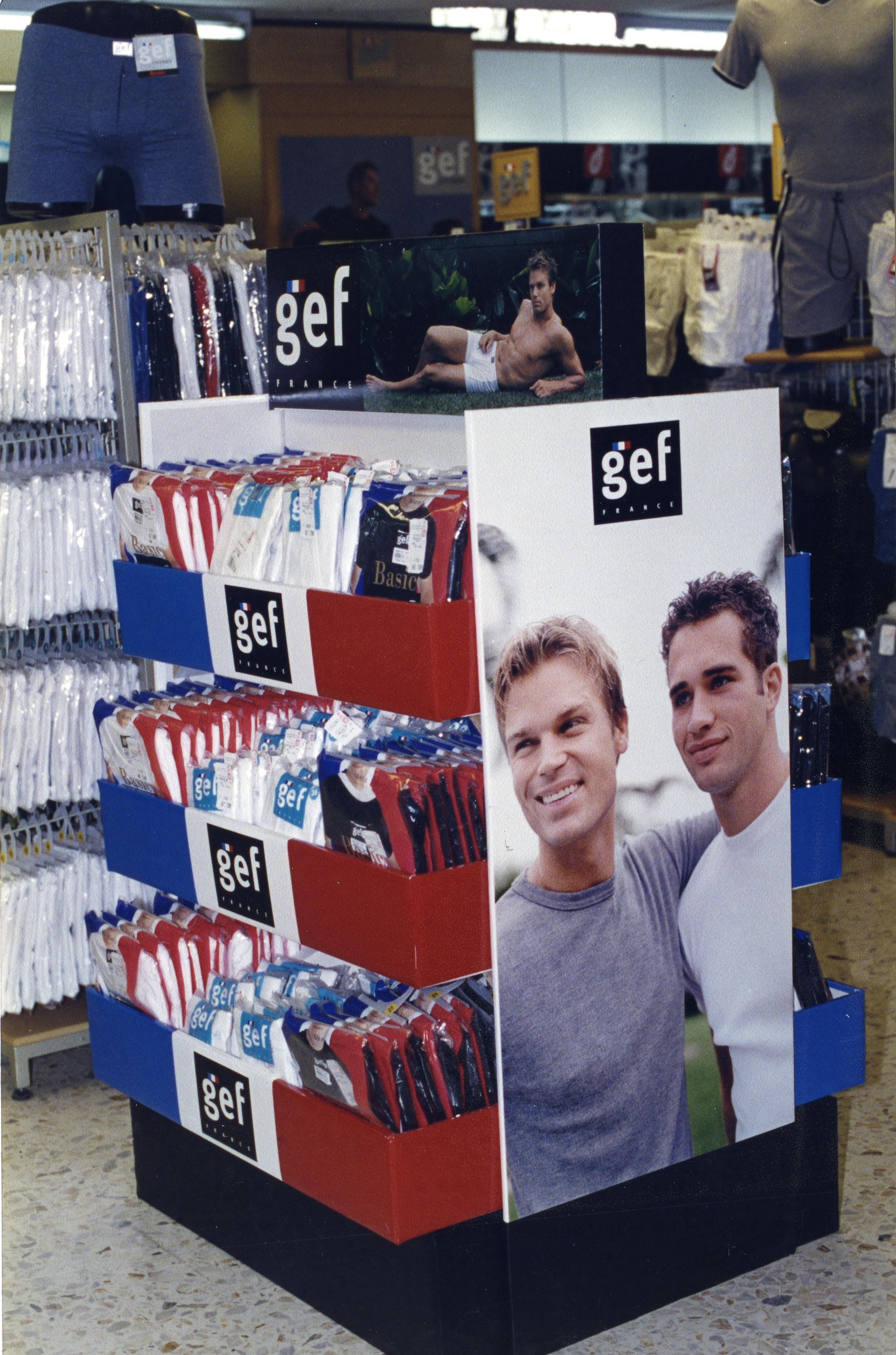 En la gráfica se observa una estantería que permite la venta de ropa interior para hombres marca GEF.