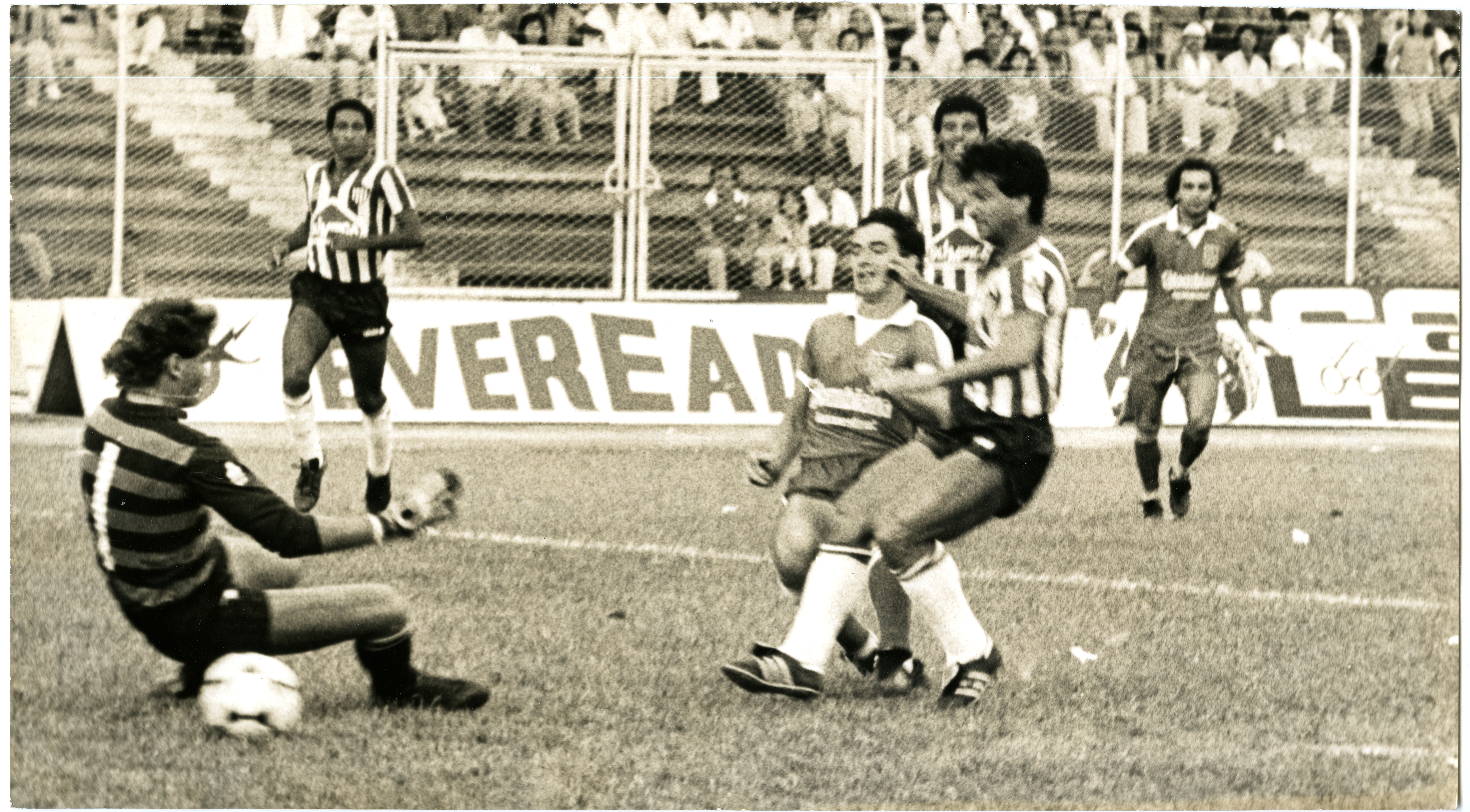 Escena del partido América vs Junior, en el estadio Olímpico Pascual Guerrero. Se aprecia al jugador Sergio Santín anotando gol al Junior
