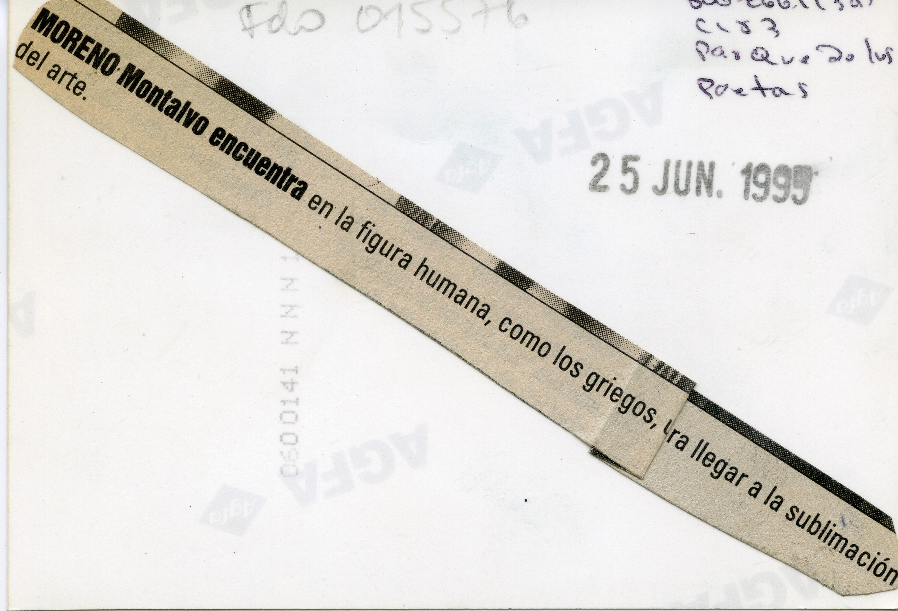 Al reverso de la fotografía se anexa un recorte: " MORENO Montalvo encuentra en la figura humana, como los griegos un medio para llegar a la sublimación del arte."