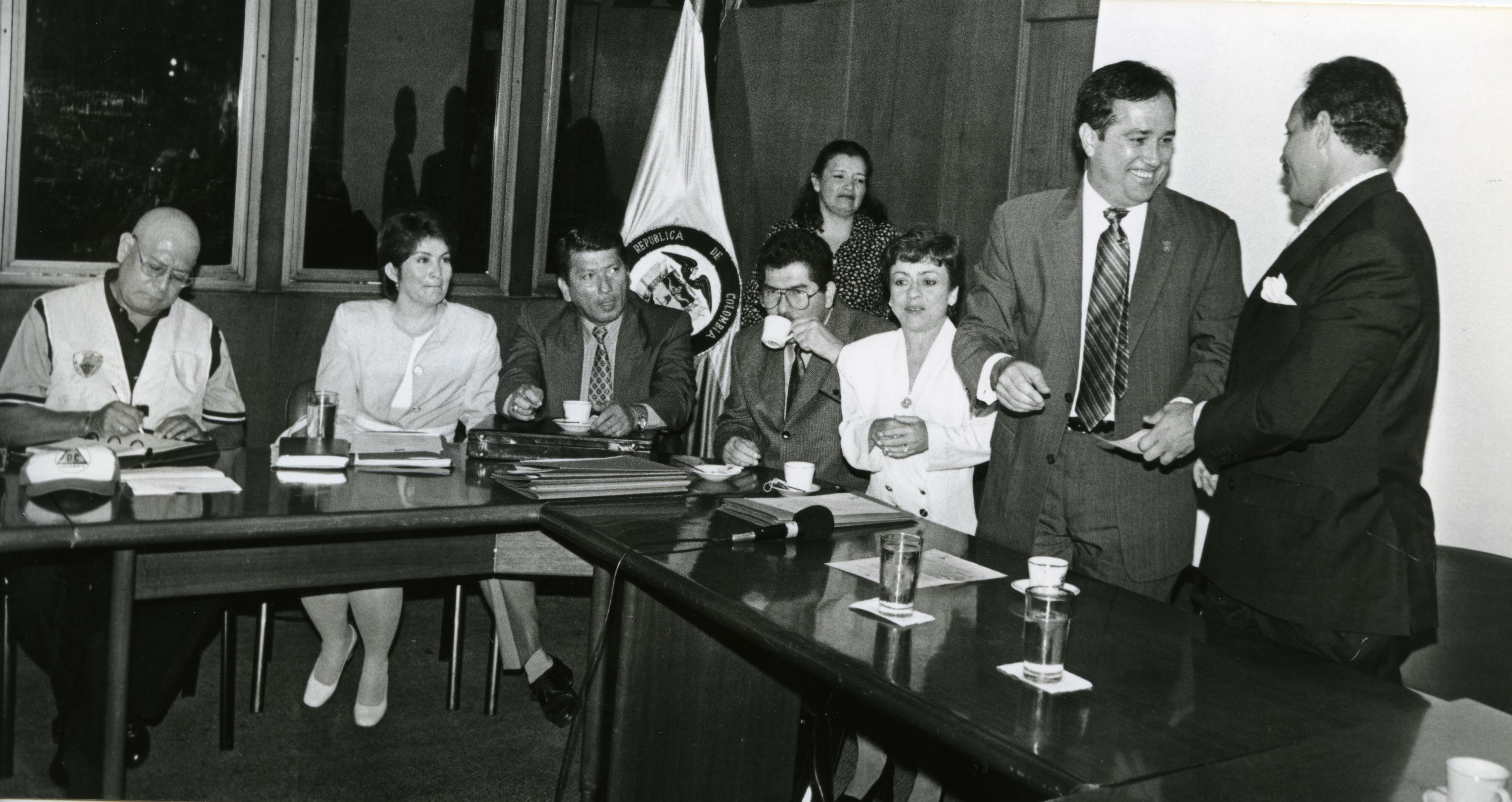 Reverso: Ayudas a Desplazados. El gobernador del Valle, Juan Fernando Bonilla Otoya entregó $200 millones que serán destinados a la generación de empleo de los desplazados por la violencia de Cali, Tuluá, Jamundí y Bugalagrande. En la gráfica el alcalde de Cali, Ricardo Cobo recibe recibe el cheque de manos del mandatario seccional. Foto William Gaviria - Unidad de Comunicaciones - Gobernación del Valle