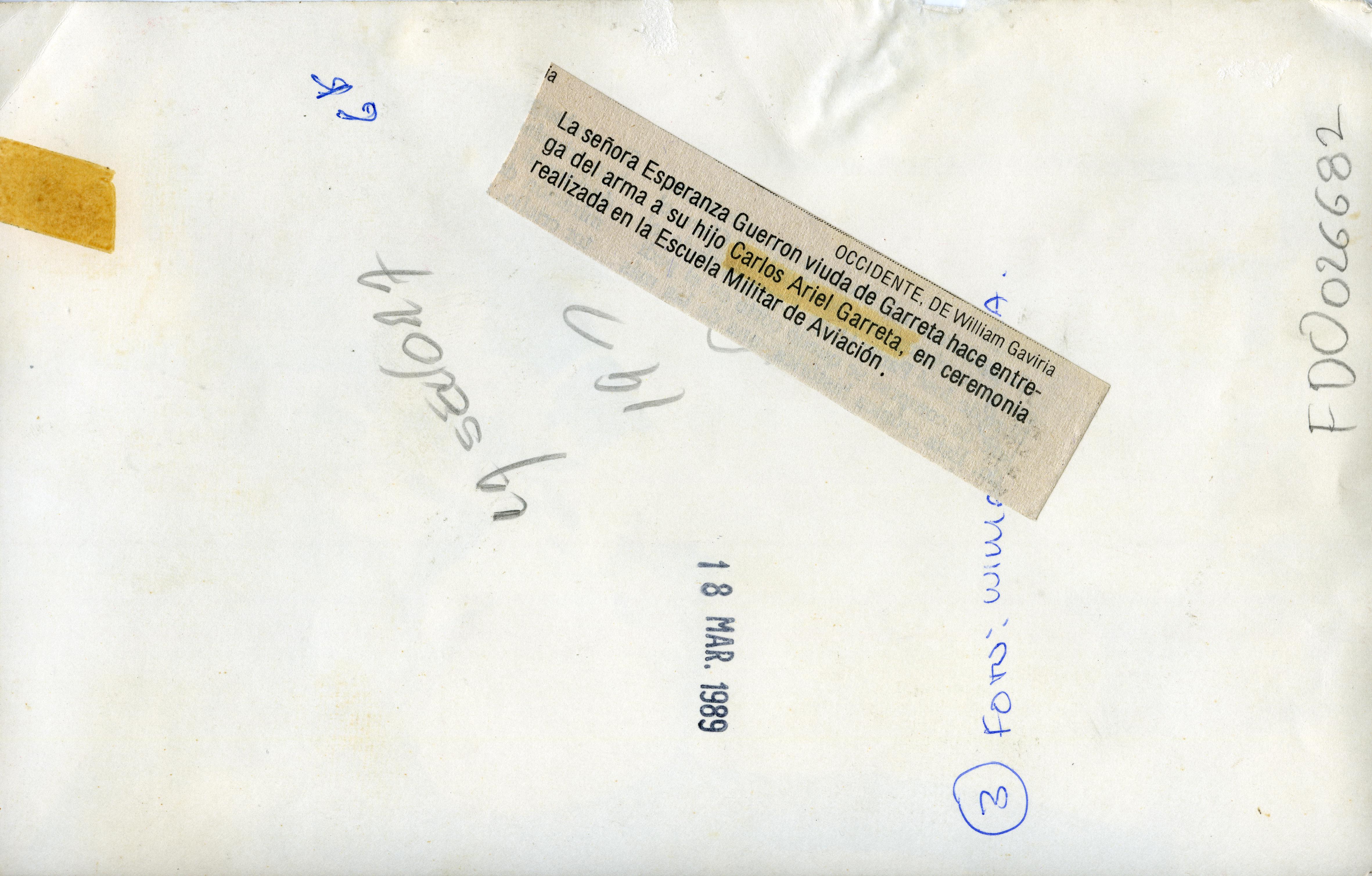 La señora Esperanza Guerron Garreta entrega el arma de su difunto esposo a su hijo Carlos Ariel Garreta en medio de una ceremonia que tiene lugar en la escuela militar de aviación de cali Marco Fidel Suárez.